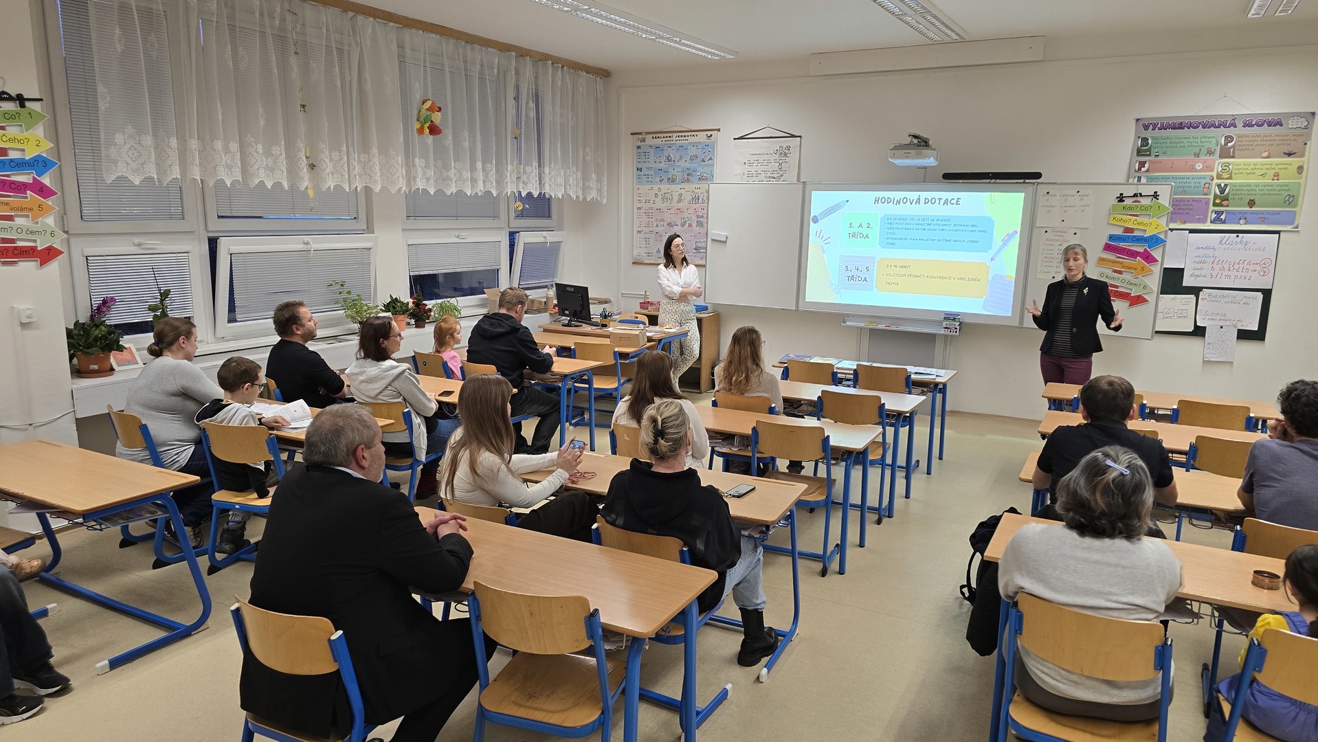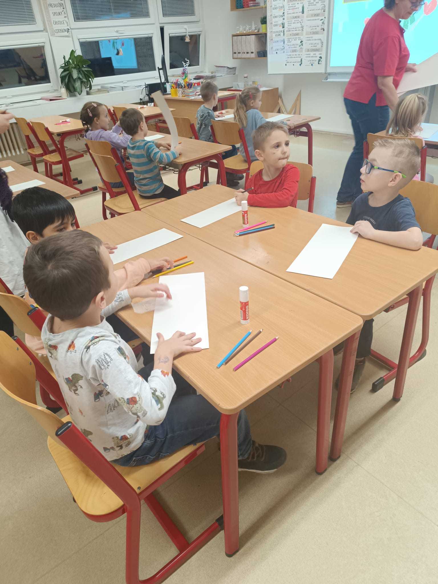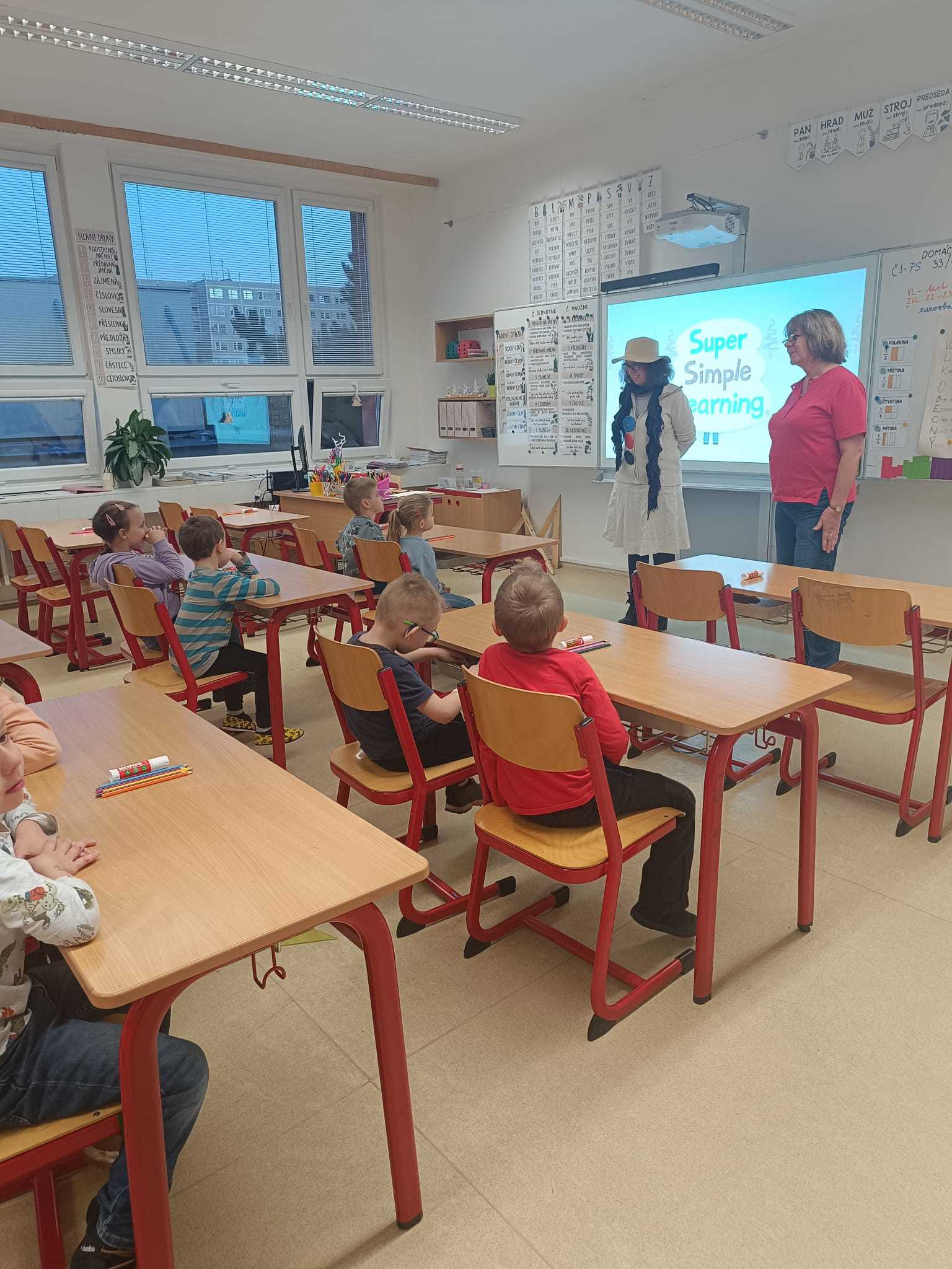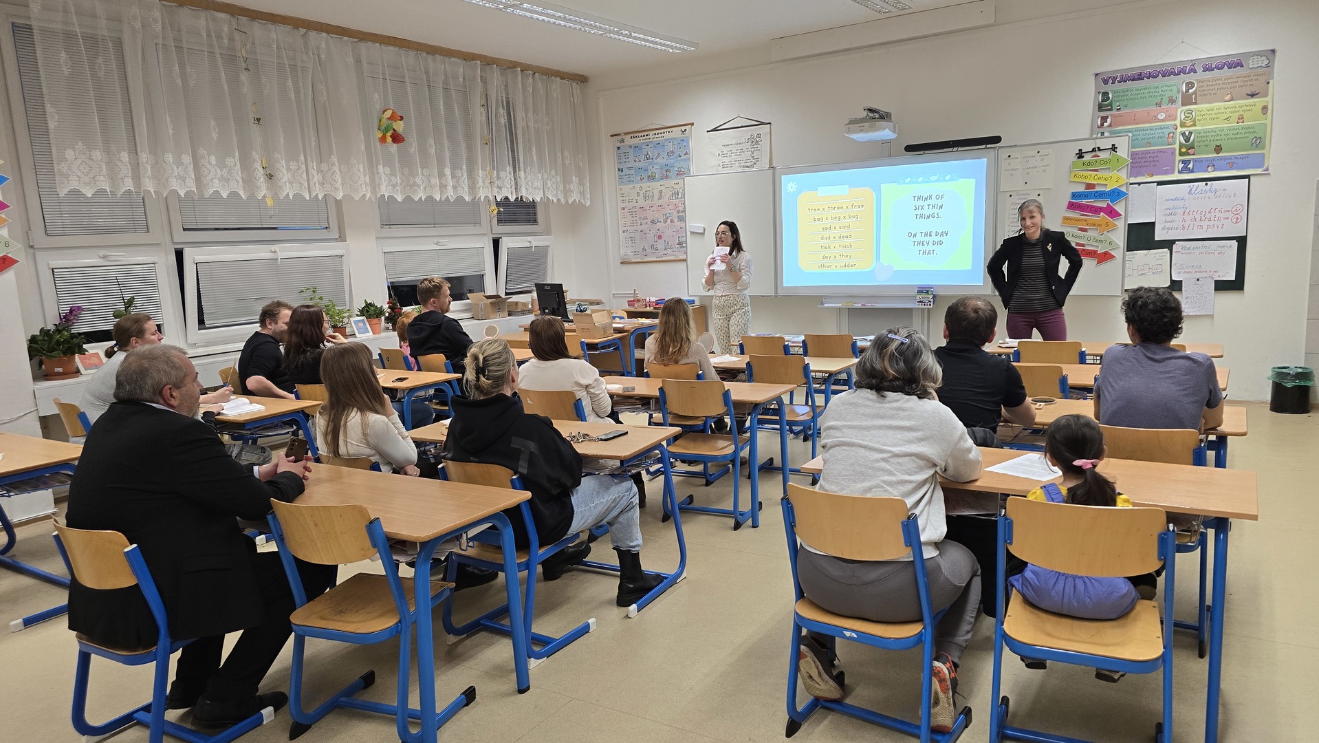 Anglicky se počítalo, pojmenovávaly se barvy, tvořil se obrázek a učila se básnička Snowman. Rodiče se mezitím dozvěděli, jak na naší škole probíhá výuka angličtiny od nejmladších žáků až po deváťáky (písničky, hry, výslovnost, soutěže, anglická knihovna, testování dle standardů MŠMT, výukové materiály, roboti, mezinárodní projekty, zájezdy apod.). Sami si vyzkoušeli něco málo z výslovnosti před zrcátky – jak pracujeme s dětmi :-)
