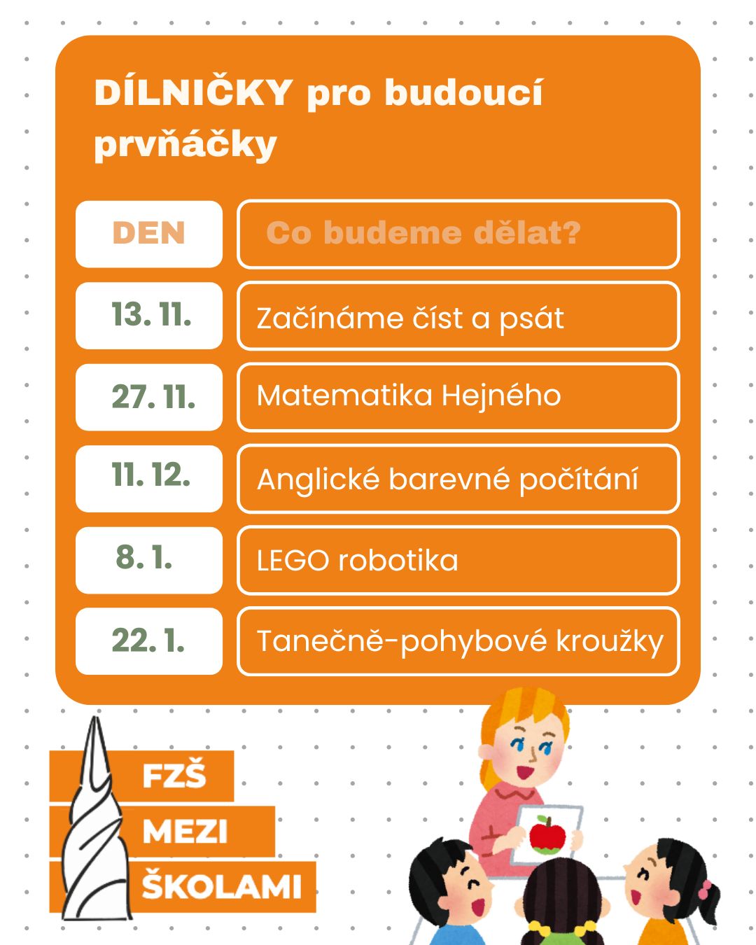 Chcete, aby vaše dítě nahlédlo do světa školy ještě před zápisem? Připravili jsme pro něj sérii zábavných dílniček, kde se naučí první písmenka, počítání podle Hejného, vyzkouší si LEGO robotiku a spoustu pohybu i angličtiny. Rodiče se mezitím mohou seznámit se životem ve škole. Mrkněte na podrobný rozpis.