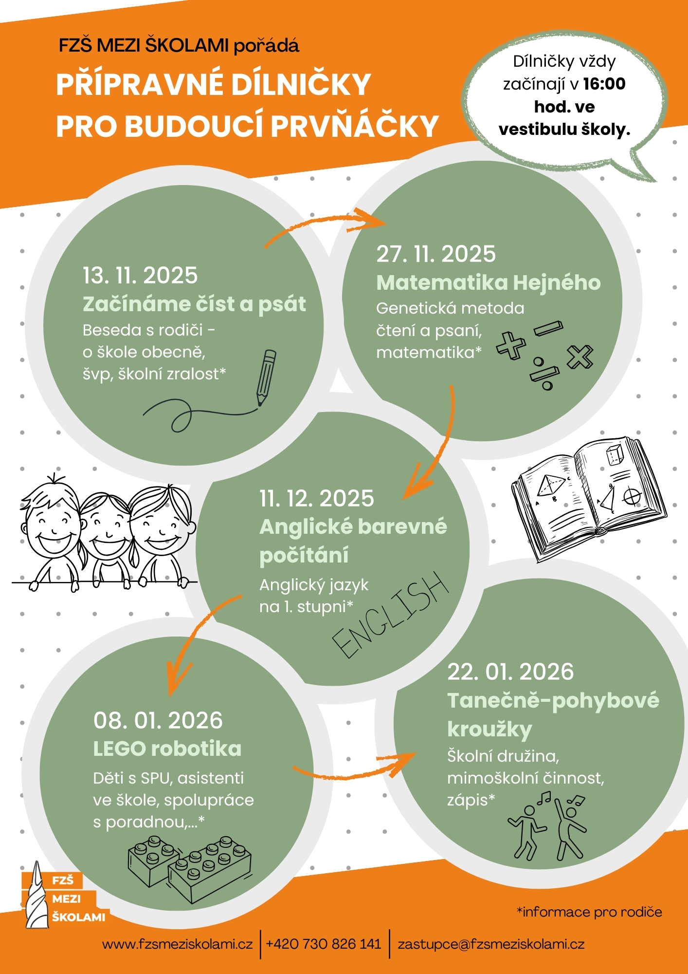 Využijte naše dílničky pro předškoláky a besedy pro rodiče k seznámení se se školou :-) Budeme se těšit opět ve čtvrtek 8. 1. a 22. 1. od 16:00. Poslední dvě dílničky budou legorobotická a tanečně-pohybová! Info v článku.