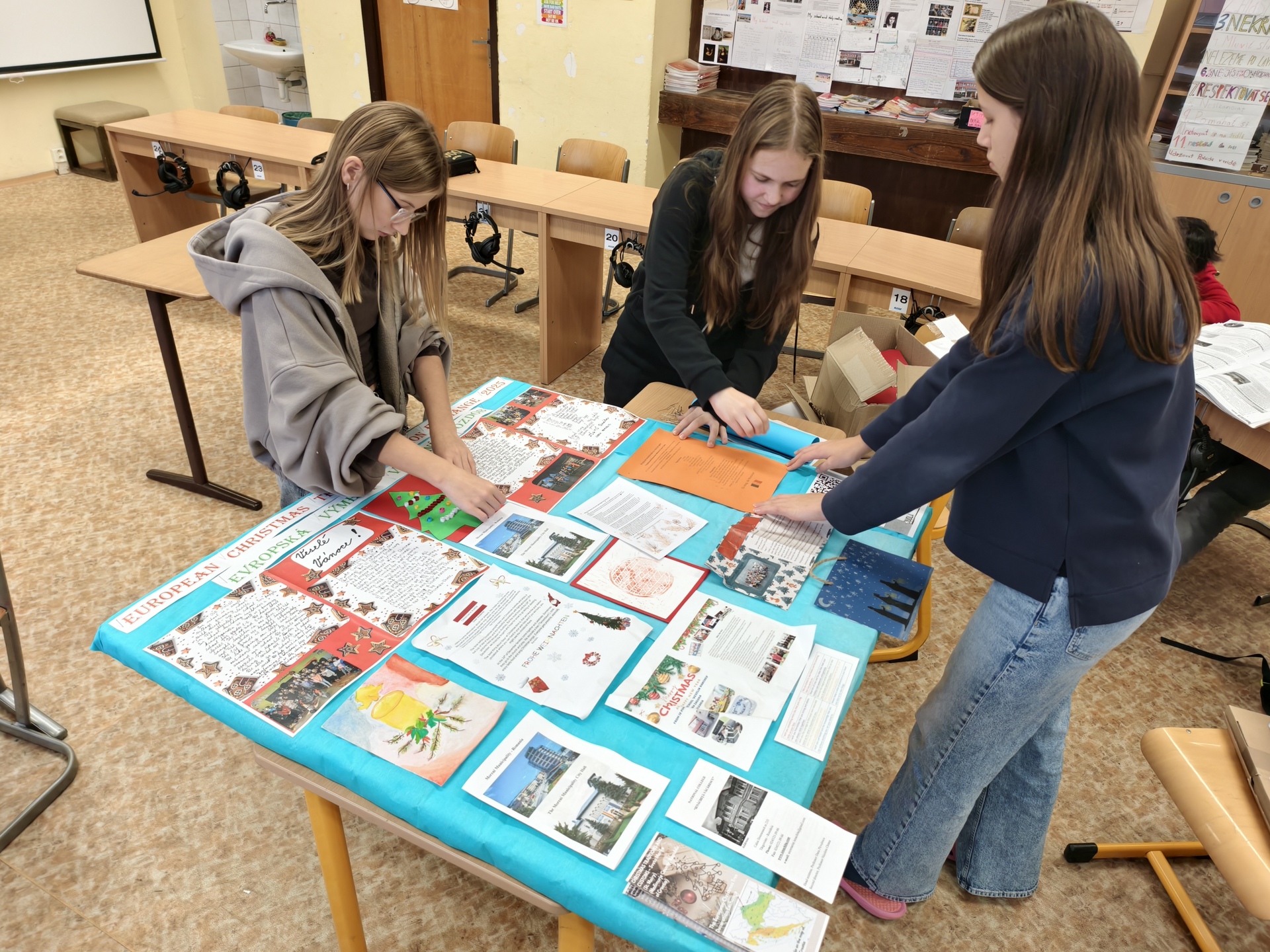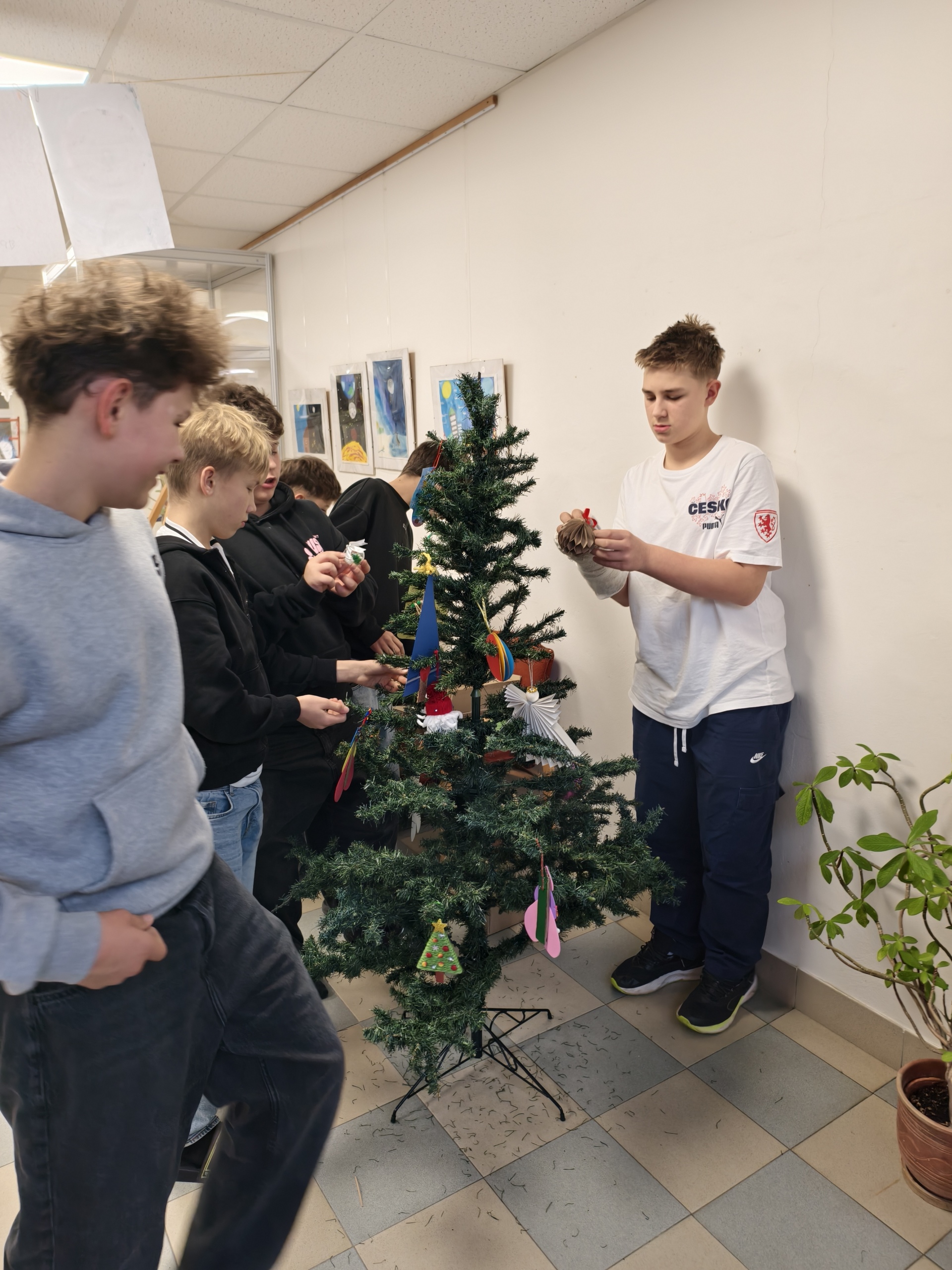 Vánoční strom i nástěnku s dopisy najdete ve vestibulu školy. Během vánočních slavností se určitě zastavte u této části školy hned u vrátnice – dozvíte se spoustu zajímavých informací o Vánocích v jiných zemích.