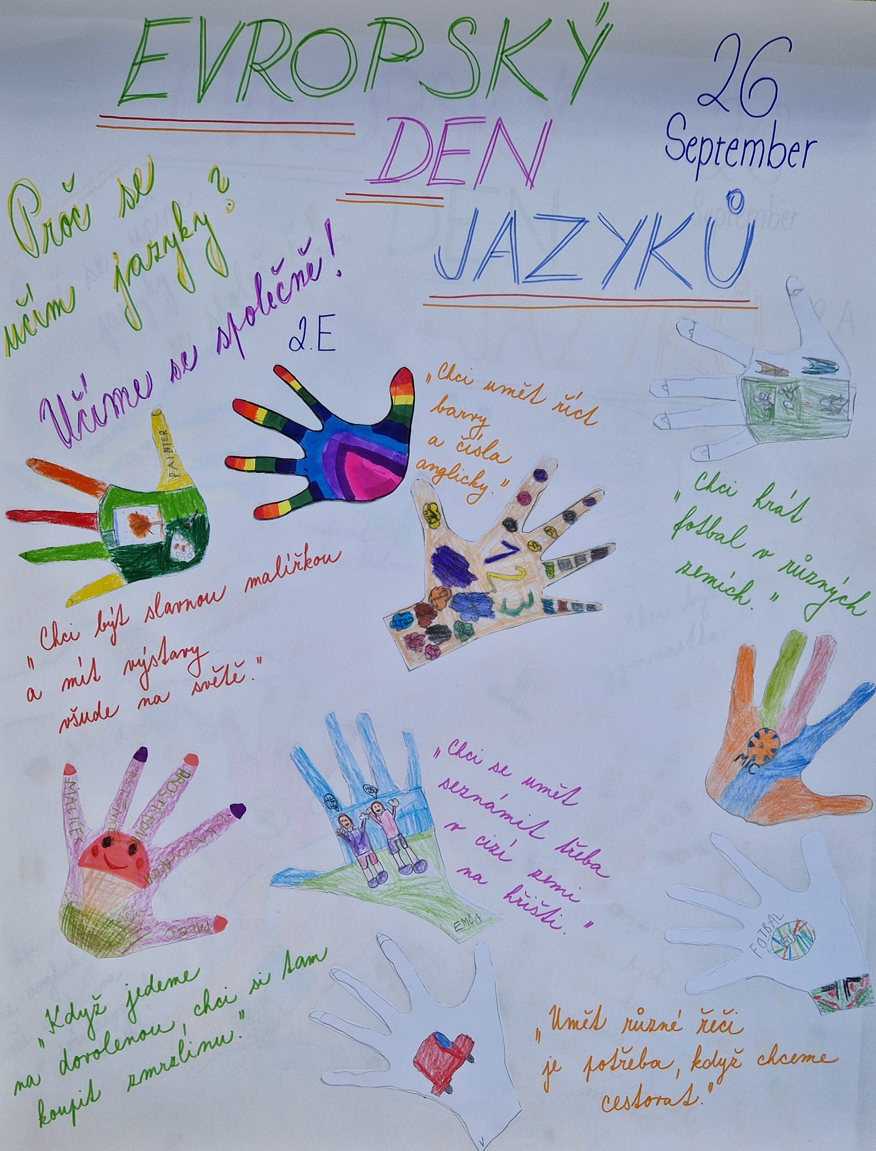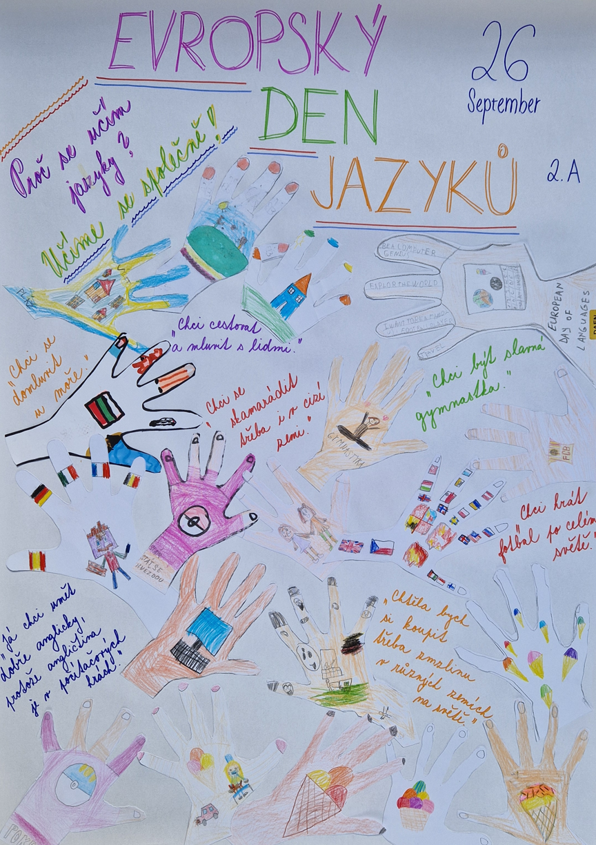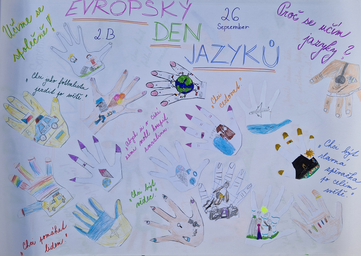 Nejmladší žáci kreslili na svoji papírovou ruku, proč se právě oni chtějí učit další jazyky. Jaké jsou jejich motivace, se můžete podívat na fotografiích. A proč jsme kreslili do tvaru ruky? Ruka je pro nás symbolem toho, že při učení jazyků nejsme sami. Můžeme si s kamarády plácnout, podat si pomocnou ruku, a vytvořit tak přátelský kolektiv, ve kterém se nám jistě bude dobře učit.