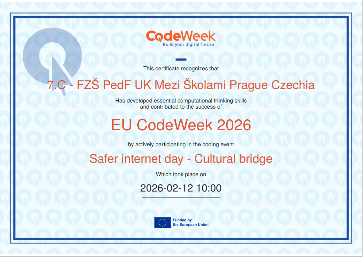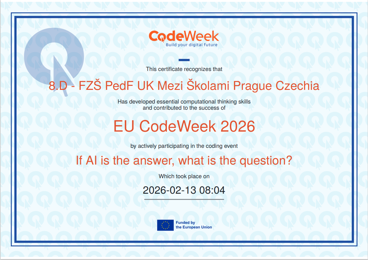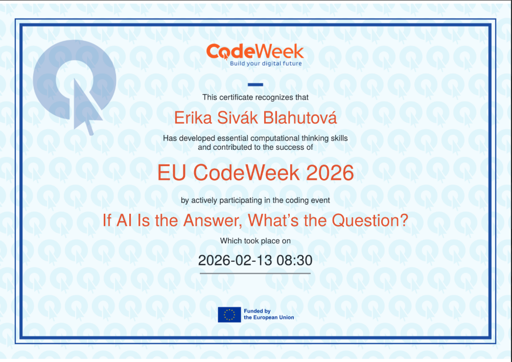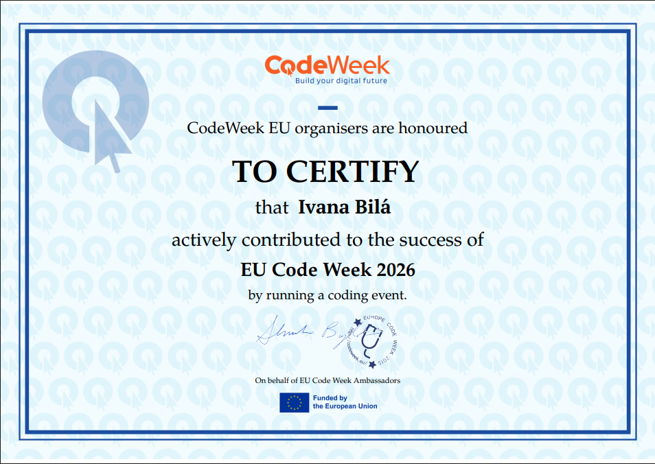 Také naši žáci se do Evropského týdne programování zapojili prostřednictvím různorodých aktivit zaměřených na rozvoj digitálních dovedností. Za svou aktivní účast získali žáci i vyučující certifikáty.