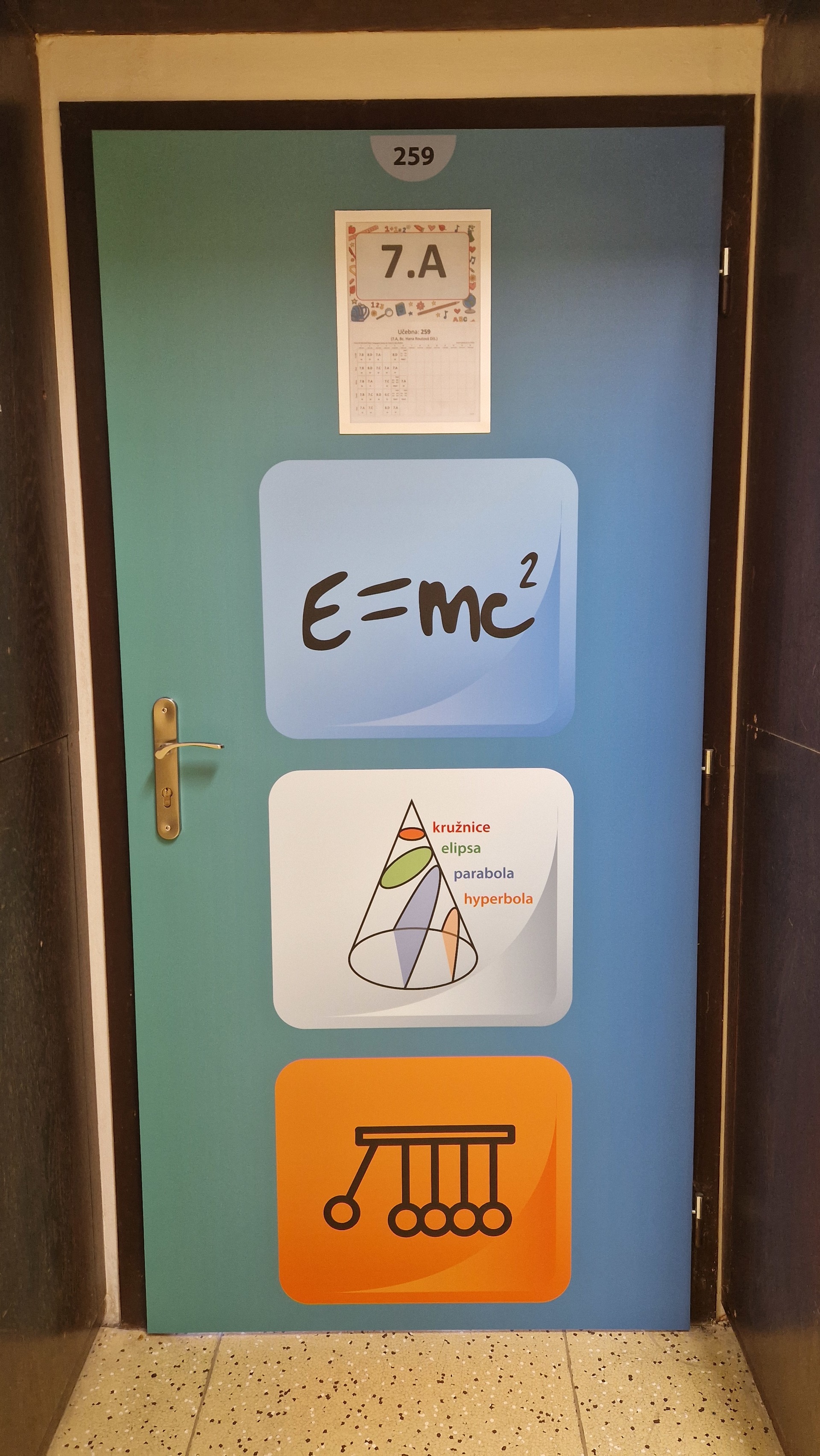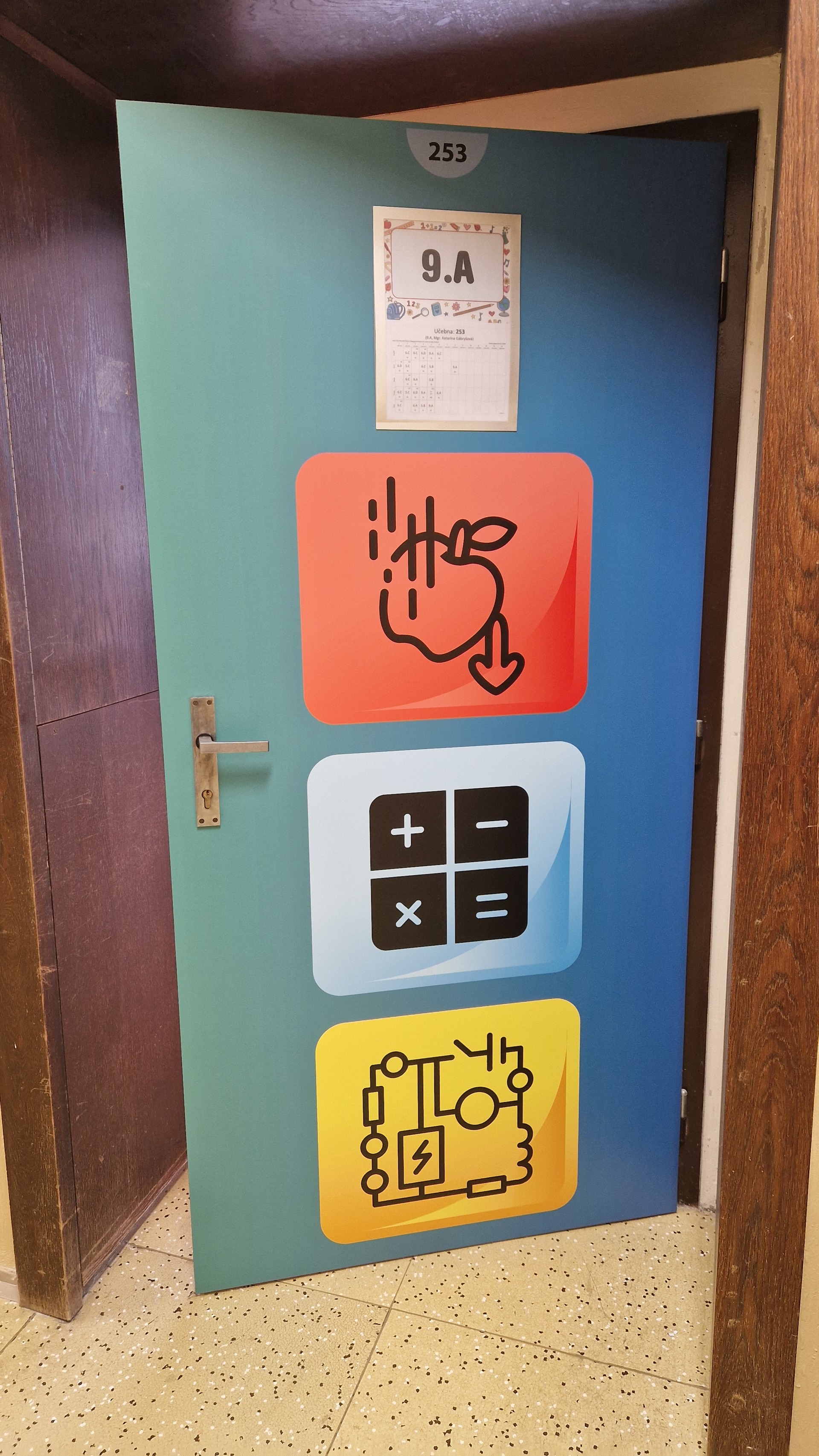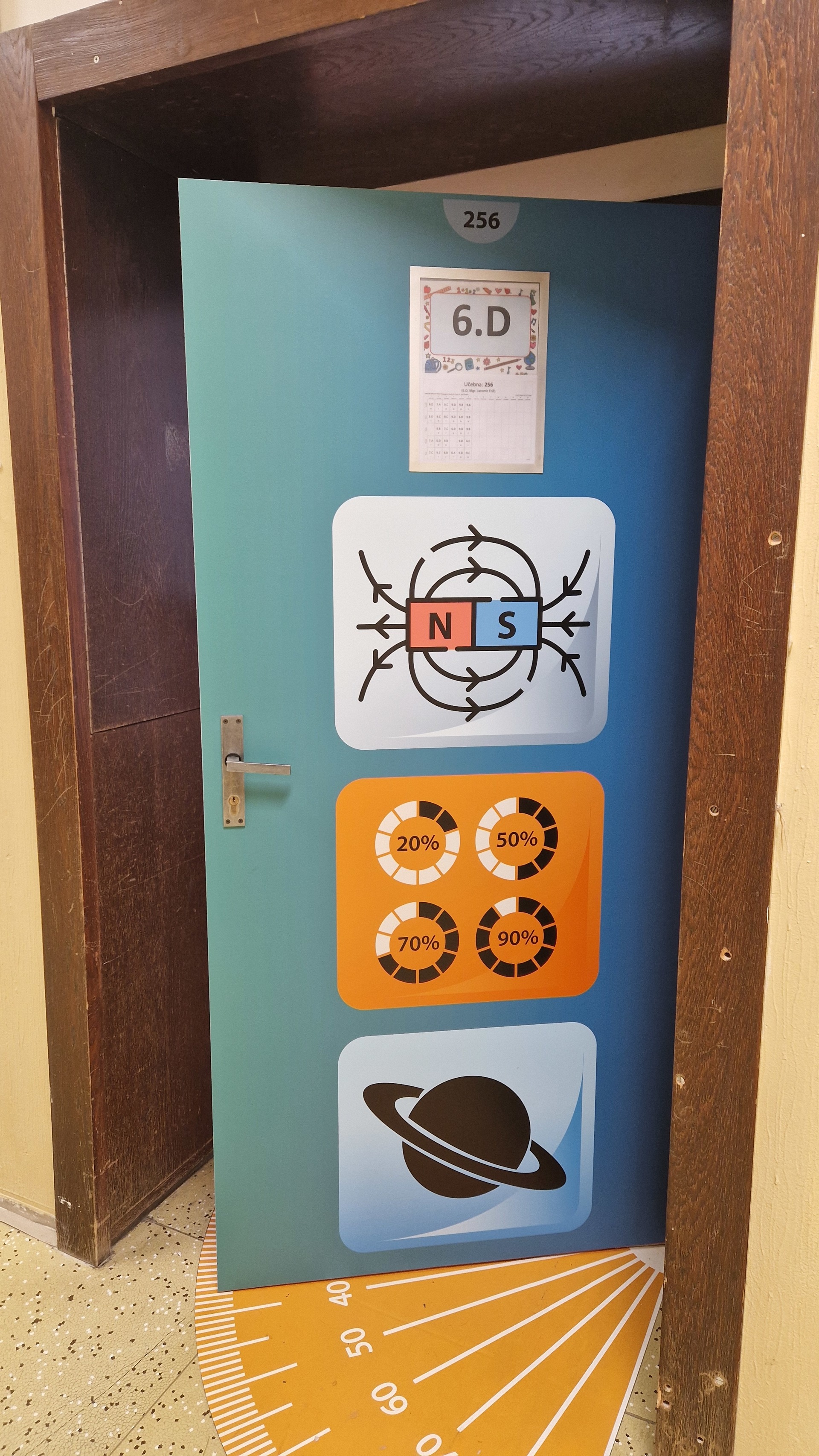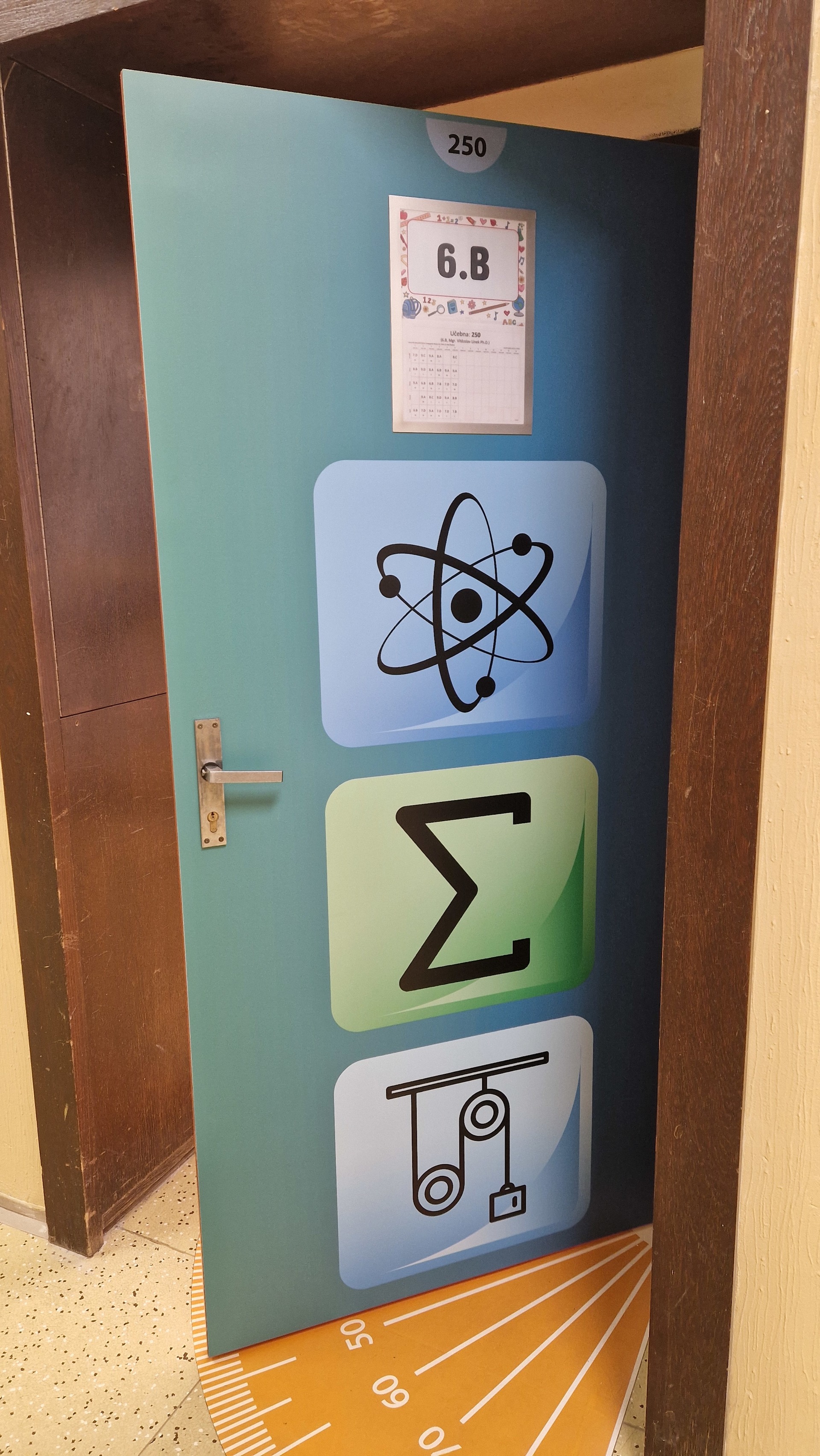 Naše škola je zase o něco krásnější. Na chodbě u učeben fyziky a matematiky přibyly nové dveře s tematickými naučnými obrázky, které prostor oživují a zároveň přibližují obsah jednotlivých předmětů.