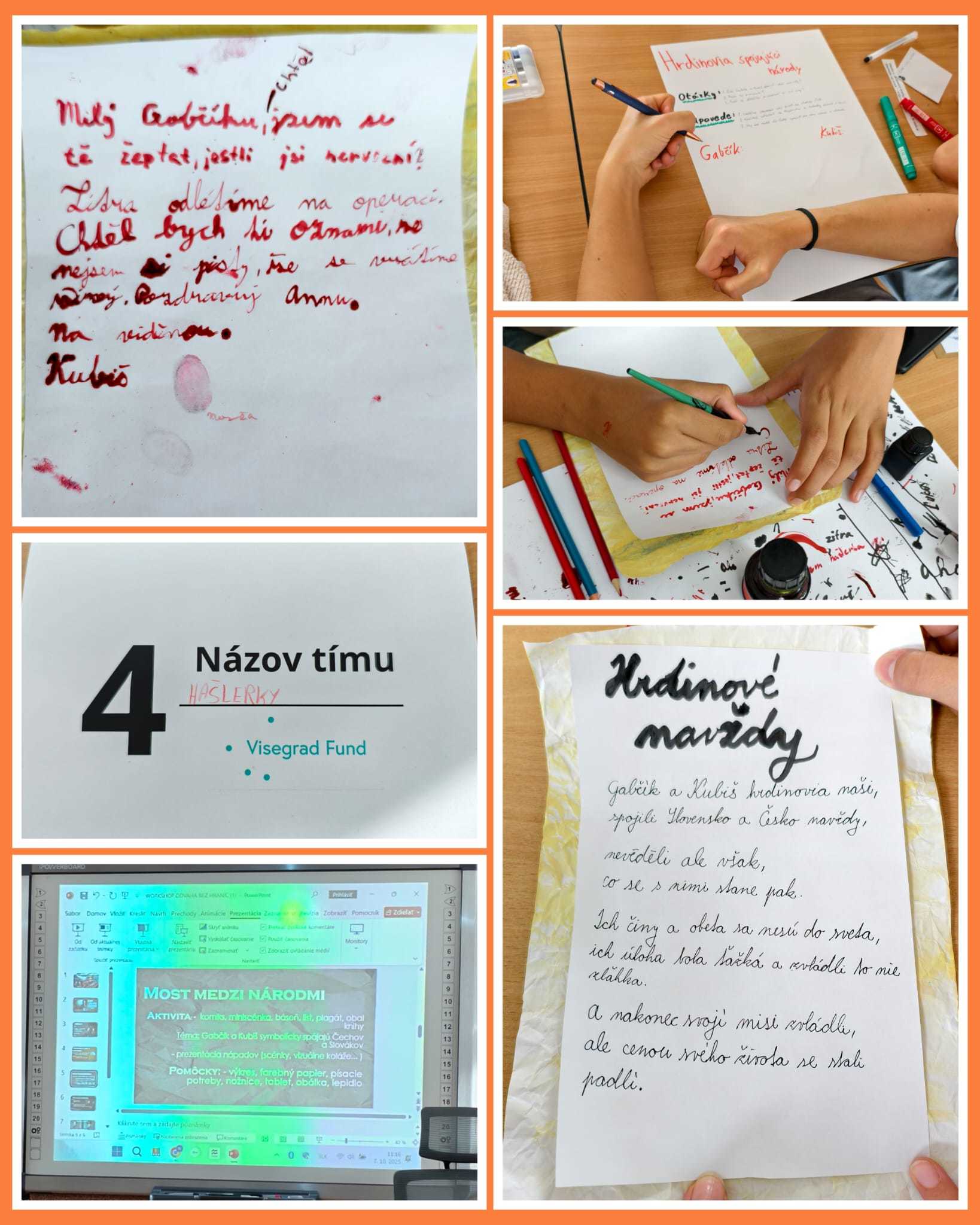 Workshop probíhal v kreativním duchu – žáci skládali básničky, psali dopis, tvořili plakát, pracovali s mottem, navrhovali obal knihy a rozvíjeli kritické myšlení. O přestávce nás čekalo velmi chutné občerstvení.