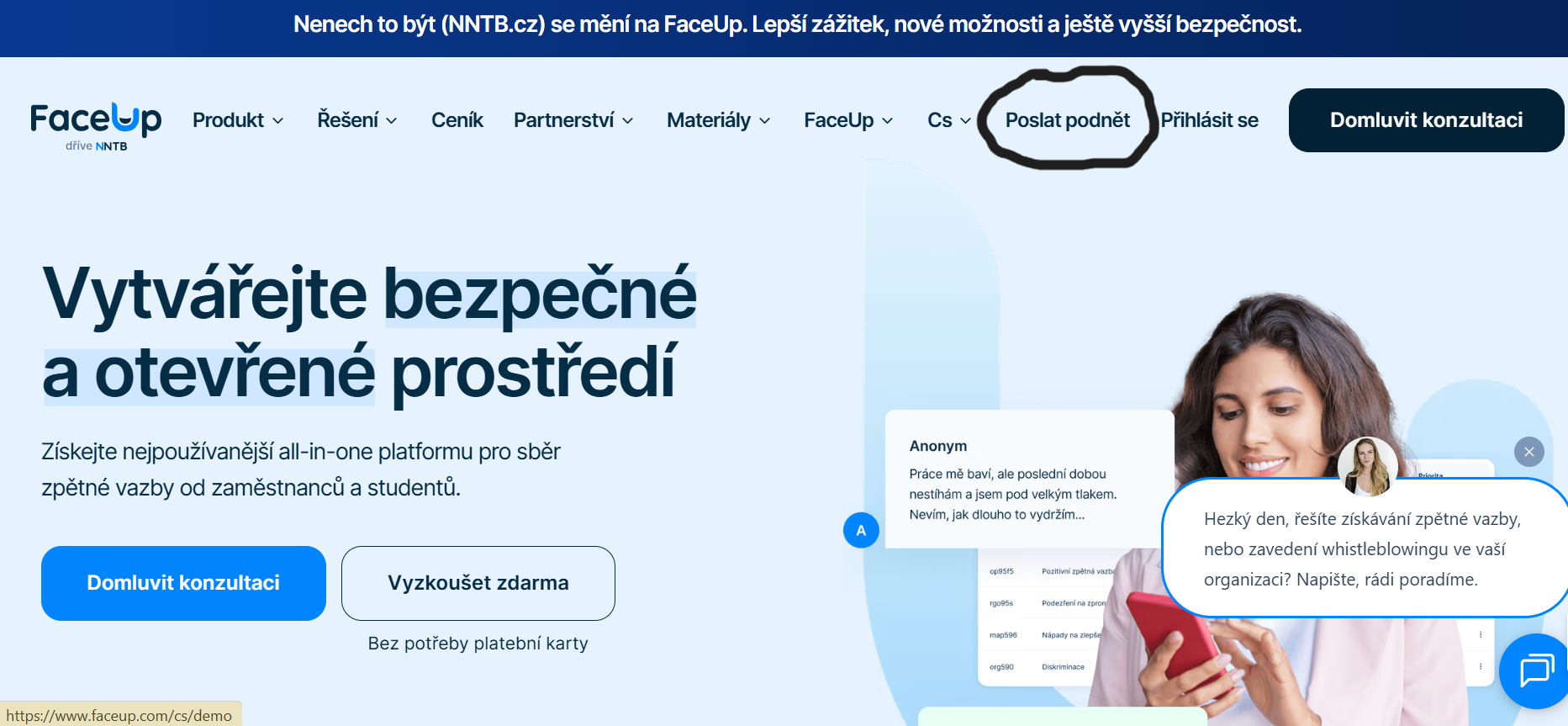 Odkaz naleznete na úvodní stránce našich webových stánek vpravo nahoře. Pro usnadnění orientace na novém webu FaceUp přikládáme také snímek s označením, kam kliknout, abyste mohli svůj podnět snadno odeslat.