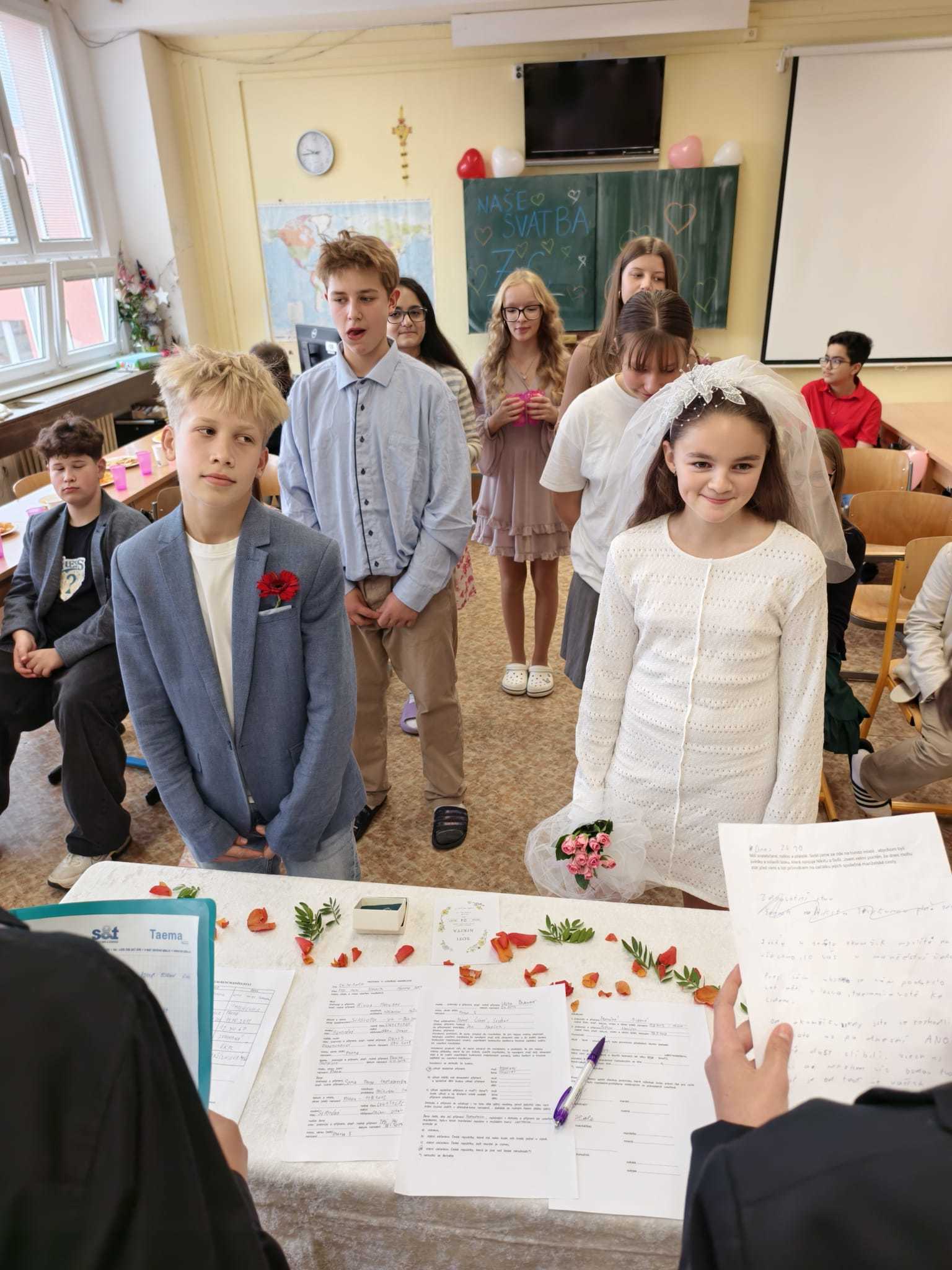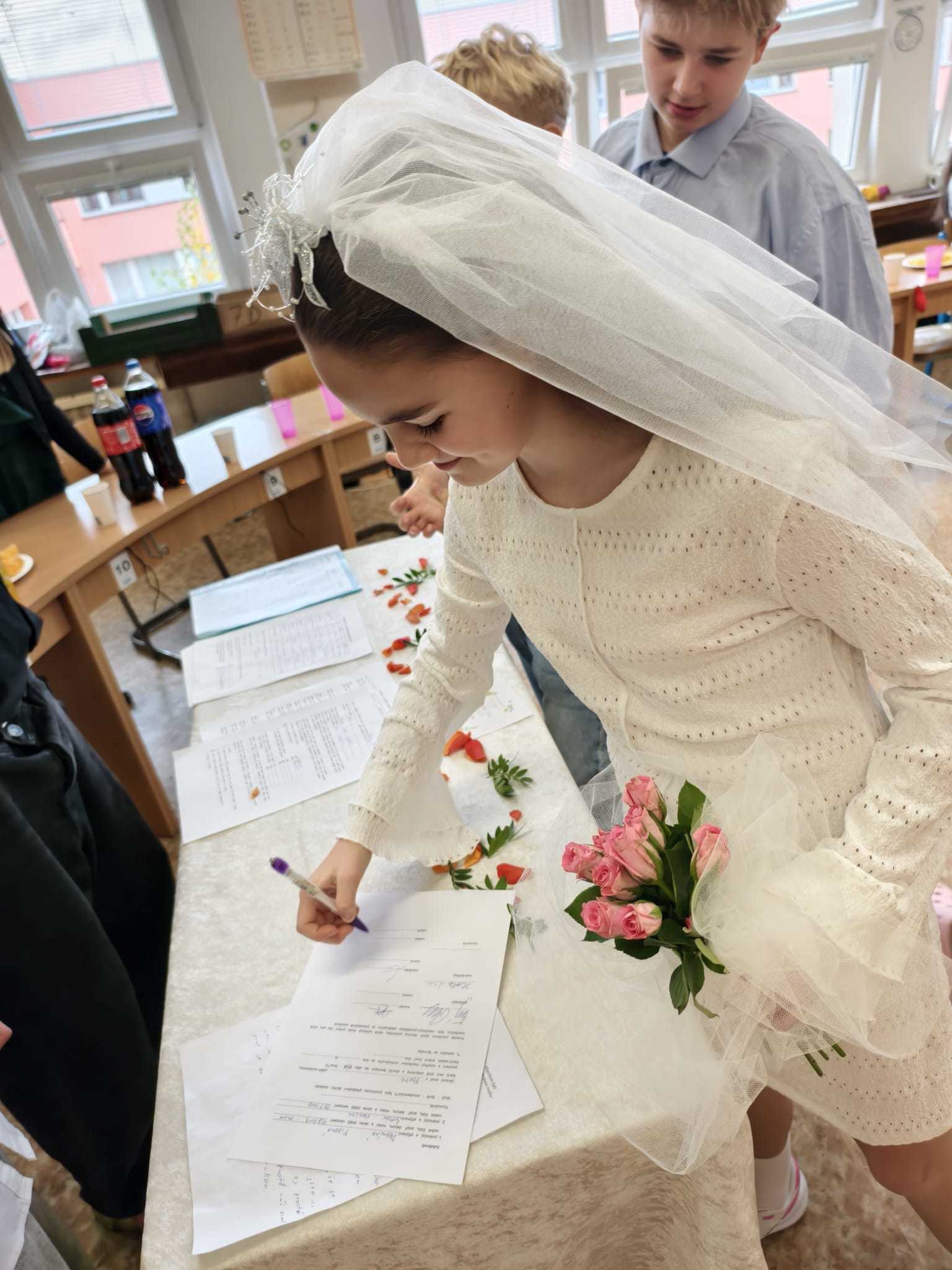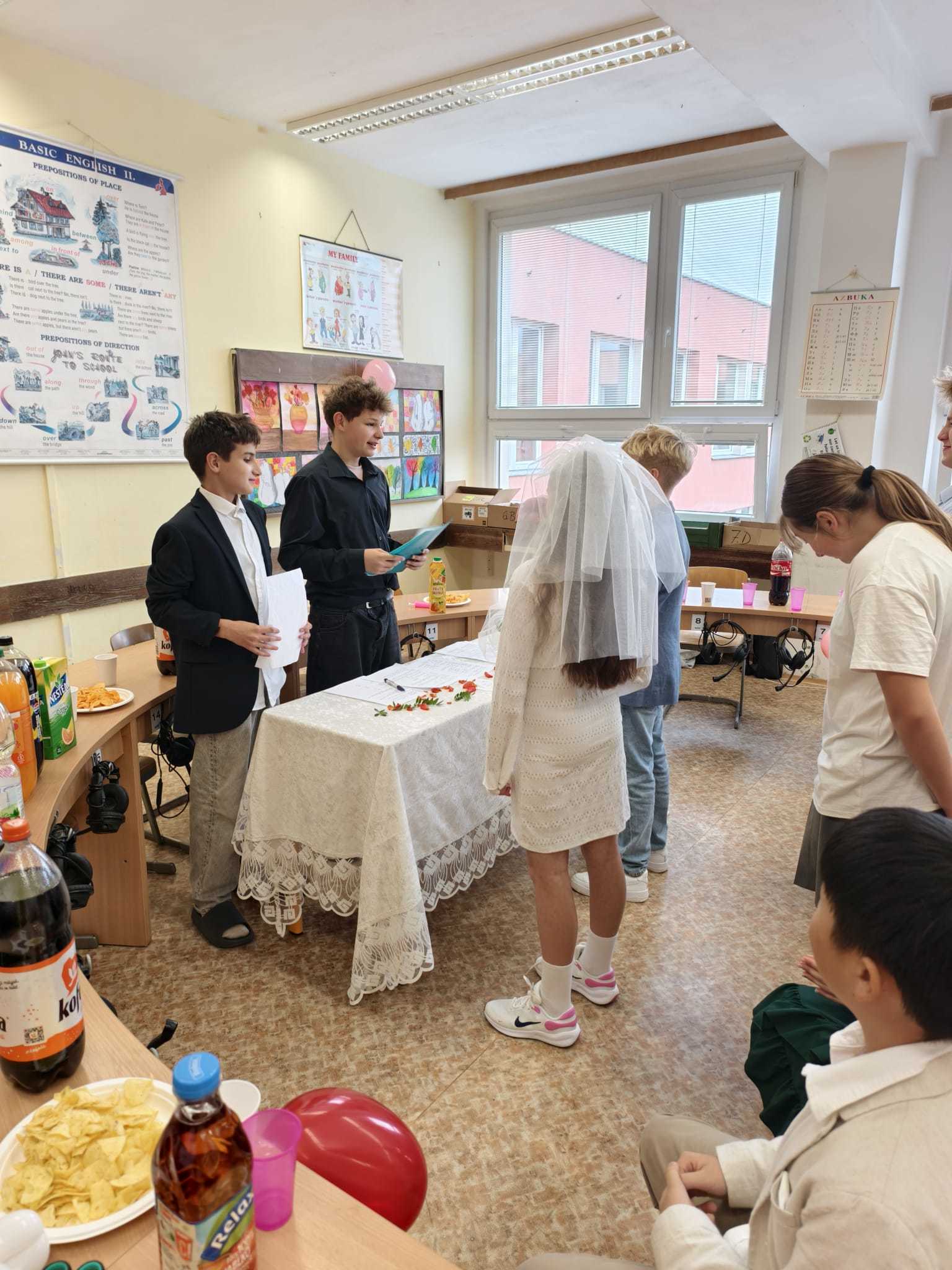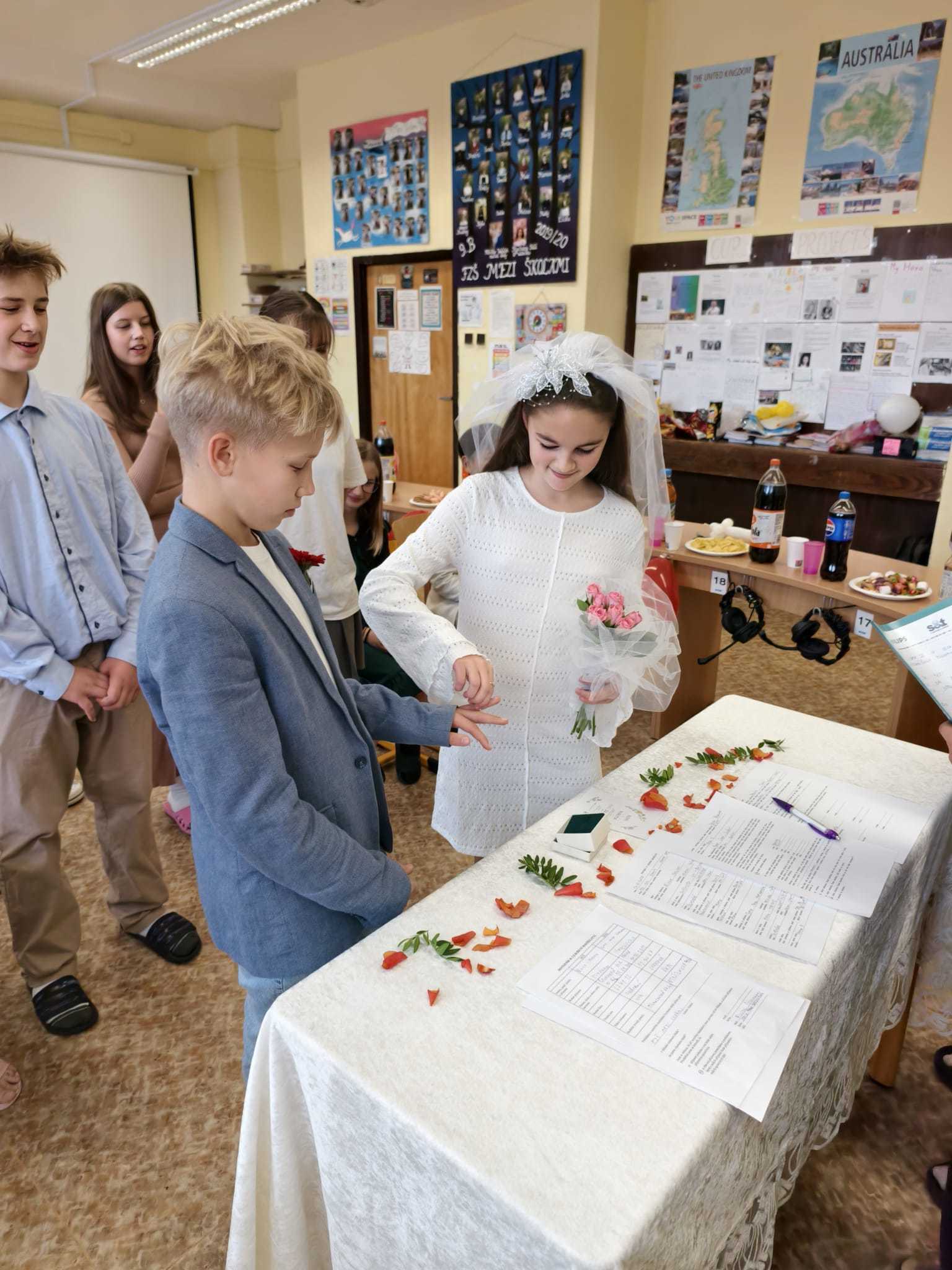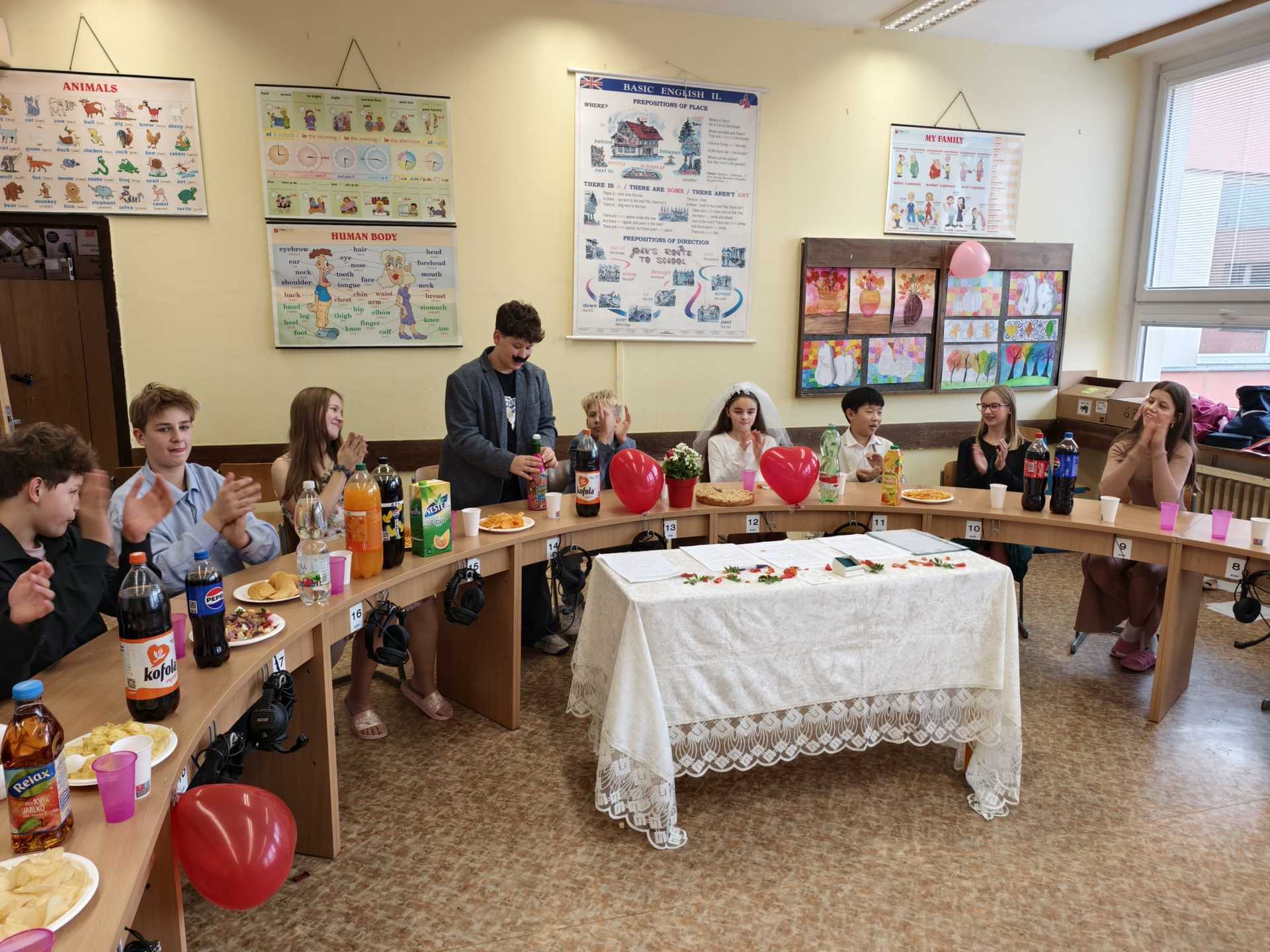 Samozřejmě nechybělo ani svatební oznámení, výzdoba, fotokoutek, hudba, pohoštění a slavnostní přípitek. Žáci mysleli i na tradiční zvyky – gratulace, první tanec novomanželů, proslov rodičů, krájení dortu nebo házení svatební kytice.