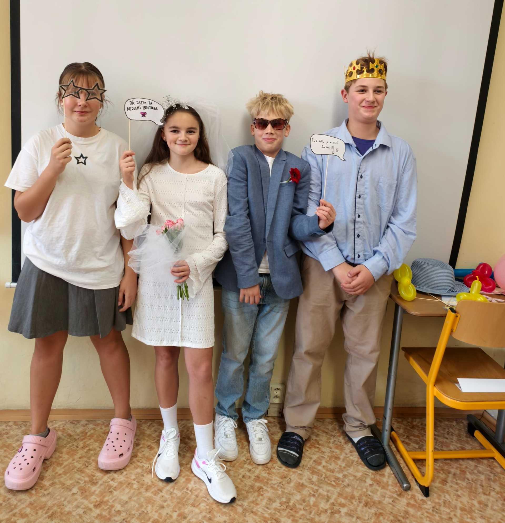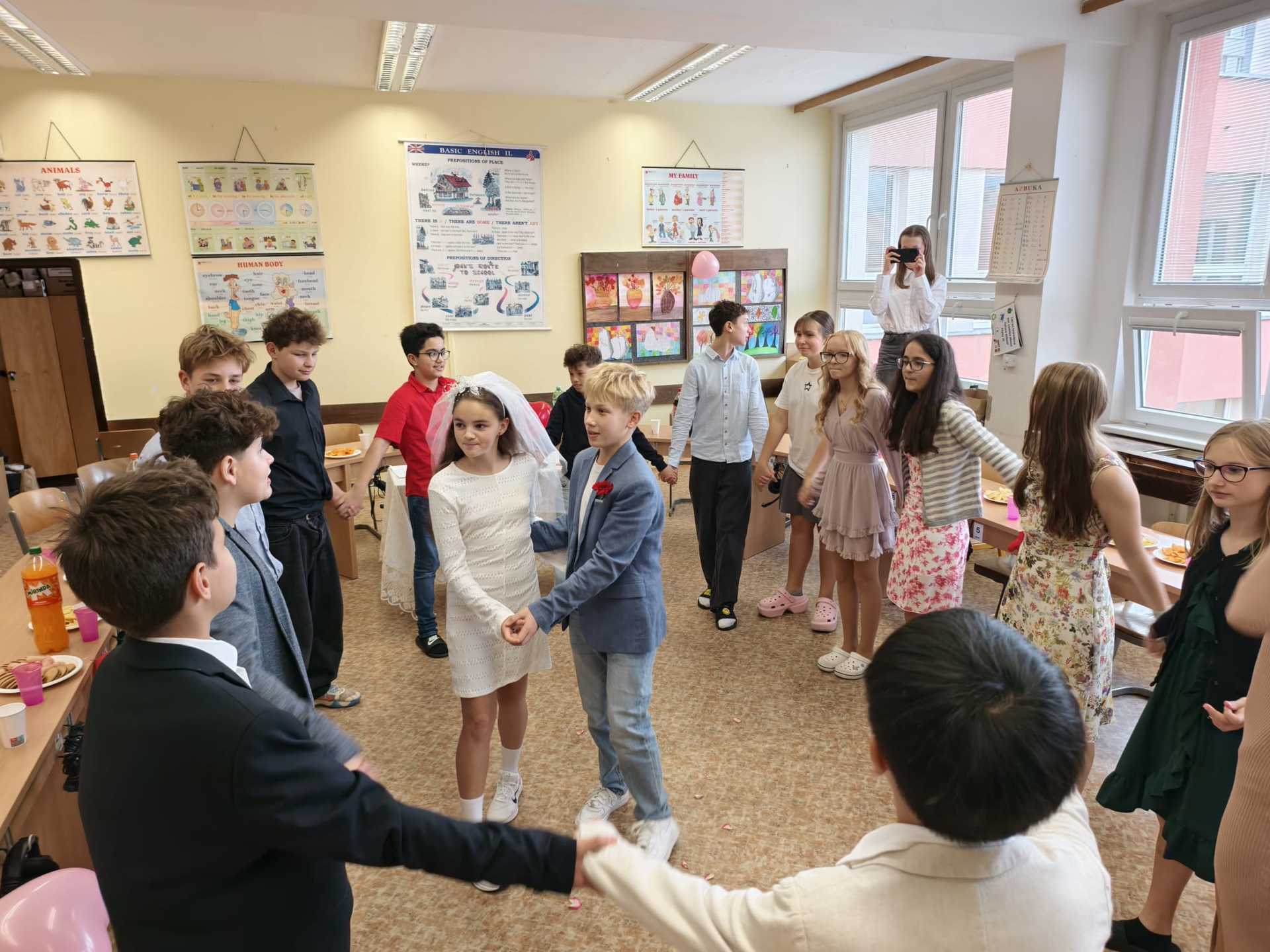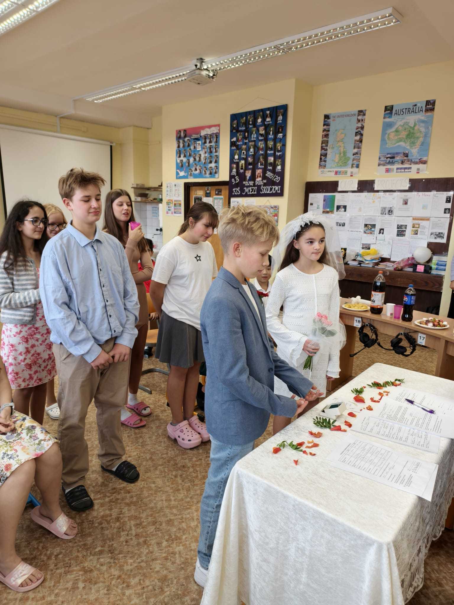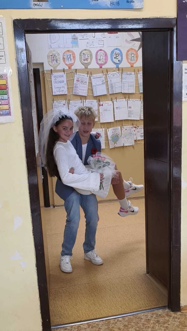 Samozřejmě nechybělo ani svatební oznámení, výzdoba, fotokoutek, hudba, pohoštění a slavnostní přípitek. Žáci mysleli i na tradiční zvyky – gratulace, první tanec novomanželů, proslov rodičů, krájení dortu nebo házení svatební kytice.
