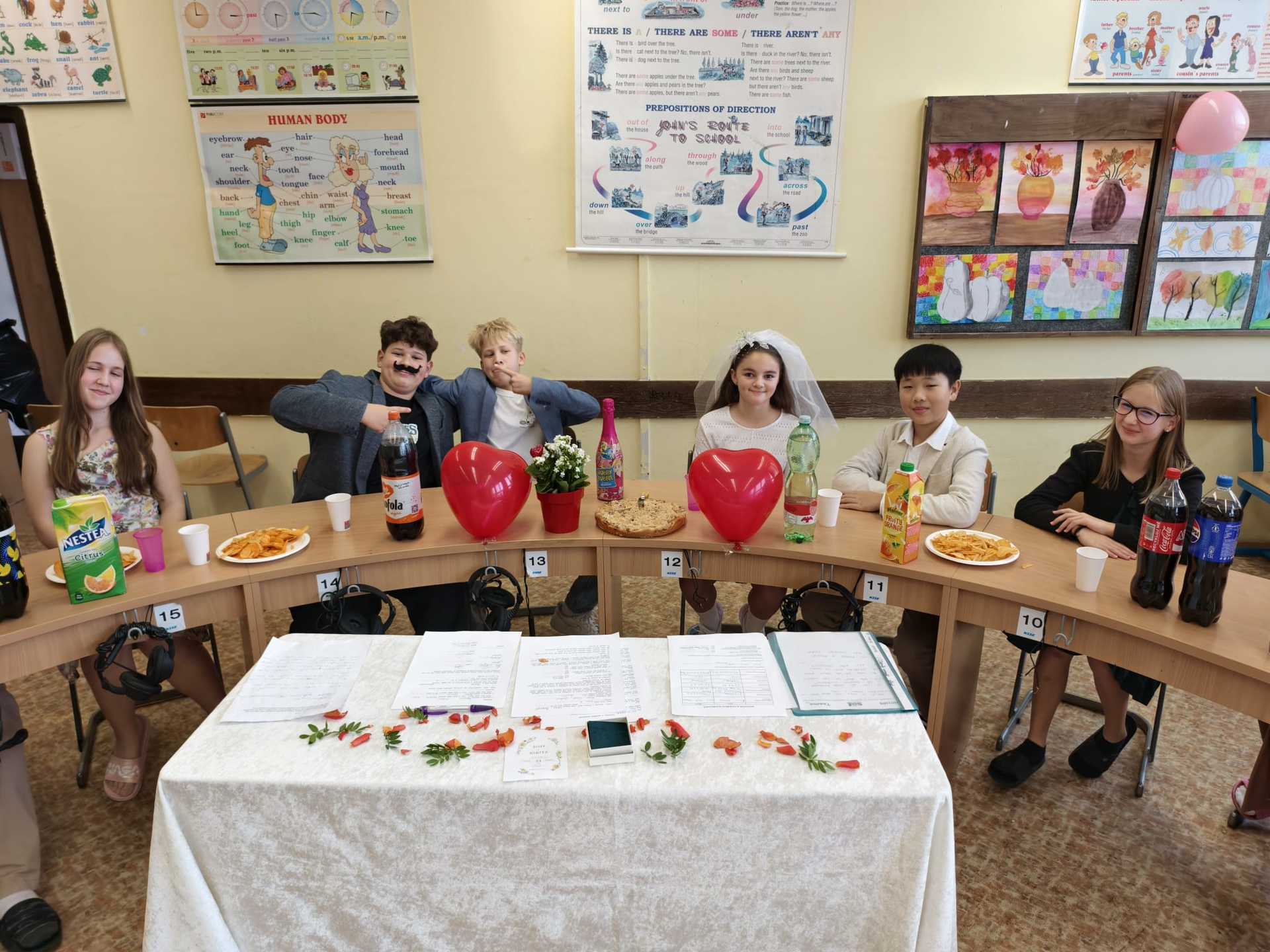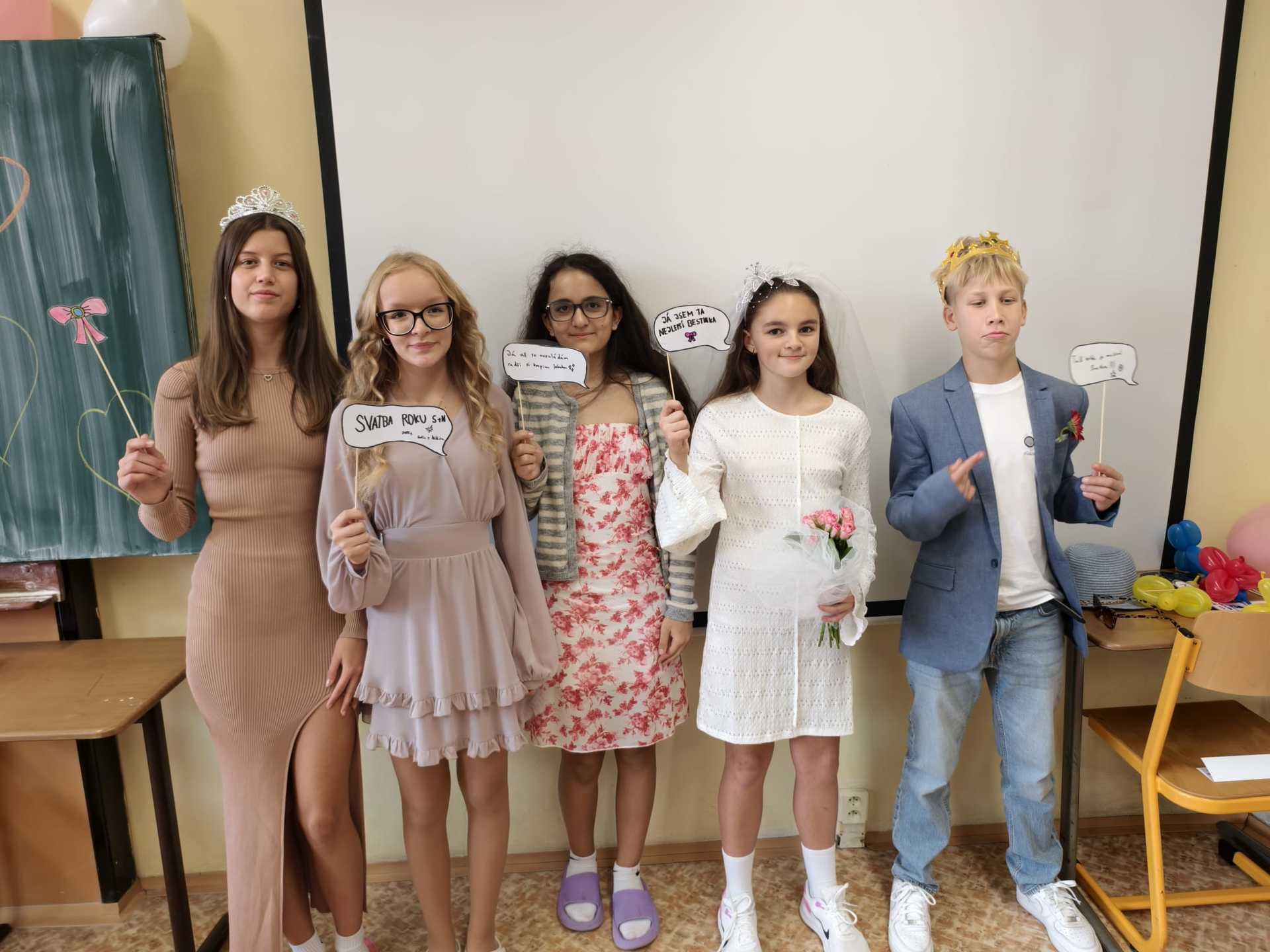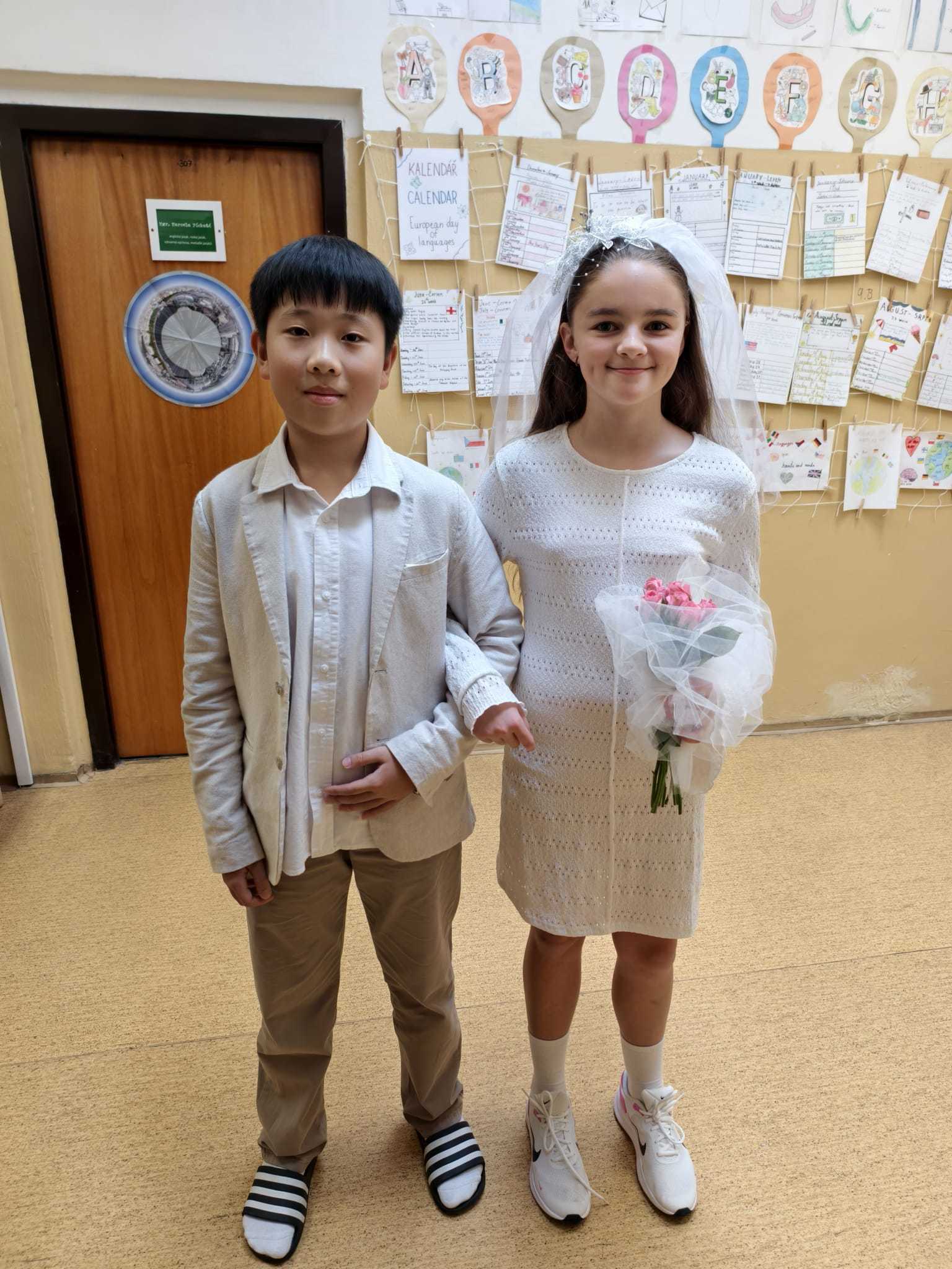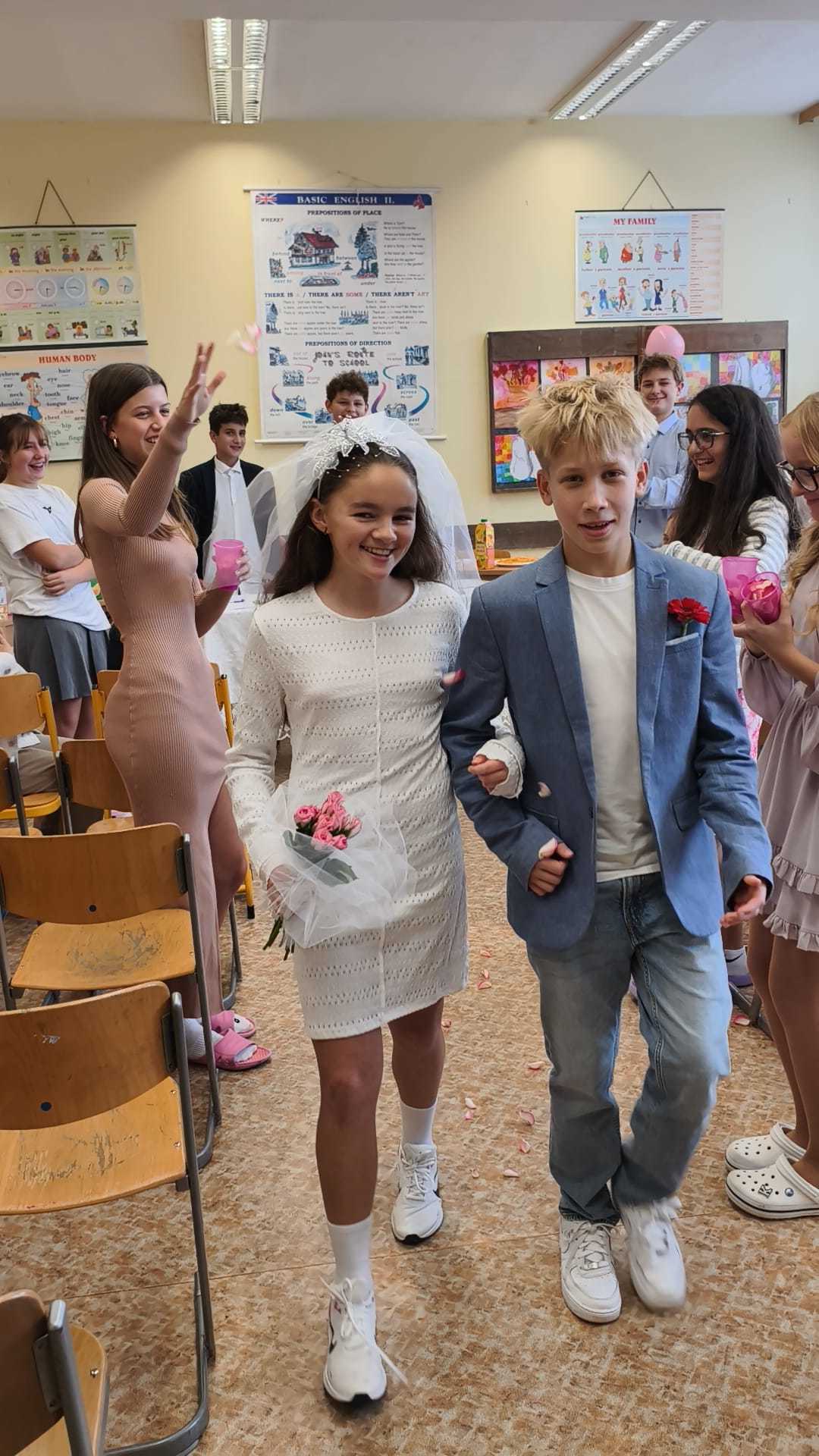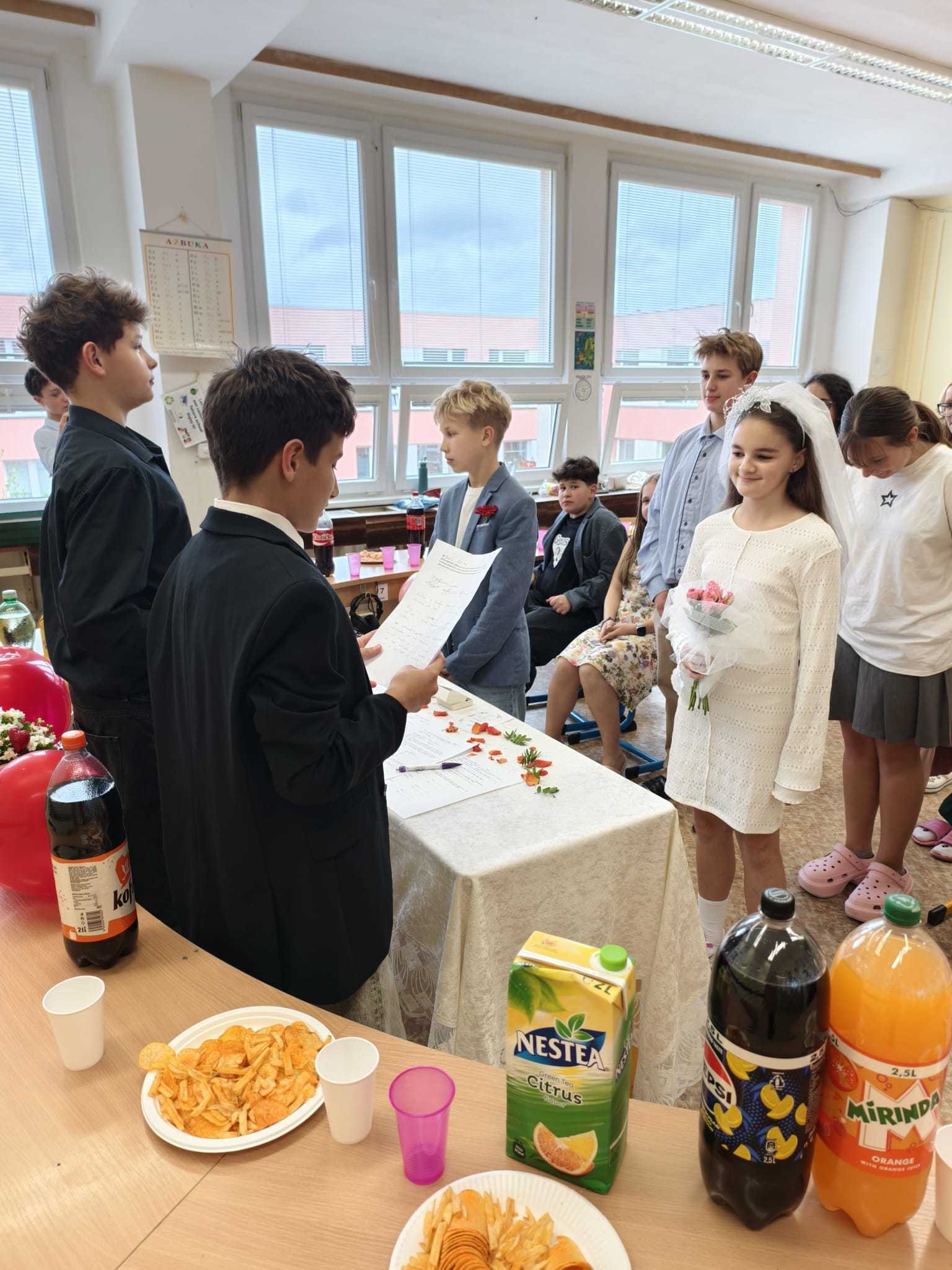 Samozřejmě nechybělo ani svatební oznámení, výzdoba, fotokoutek, hudba, pohoštění a slavnostní přípitek. Žáci mysleli i na tradiční zvyky – gratulace, první tanec novomanželů, proslov rodičů, krájení dortu nebo házení svatební kytice.