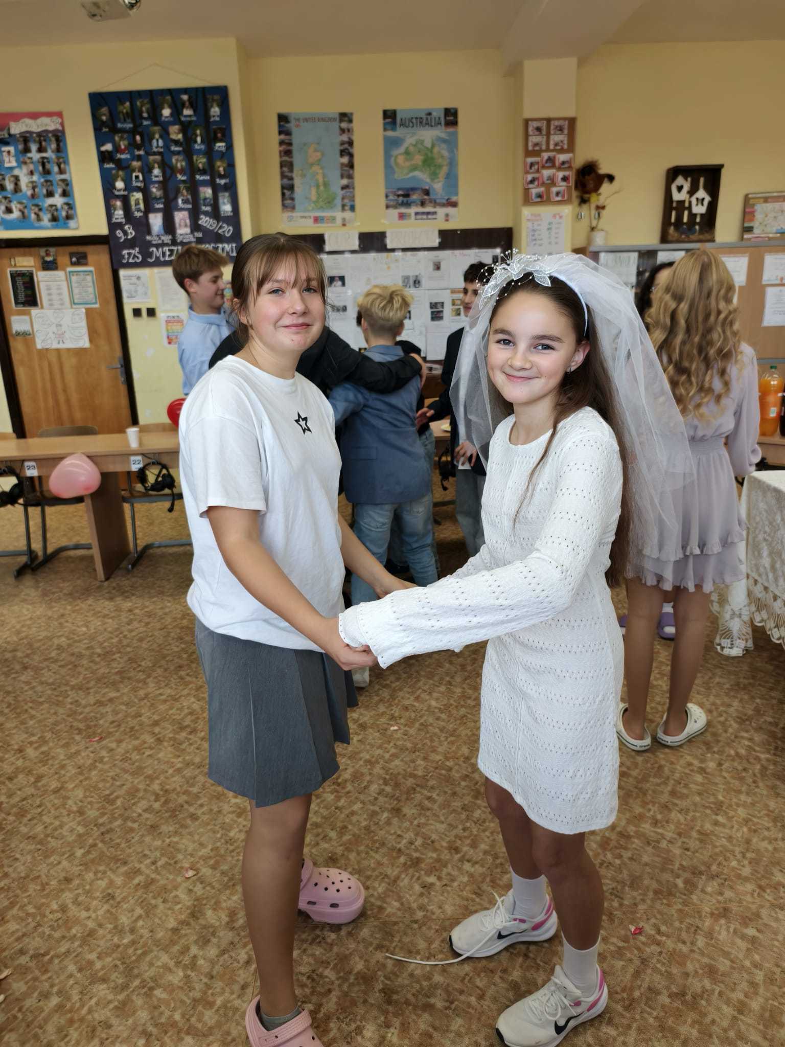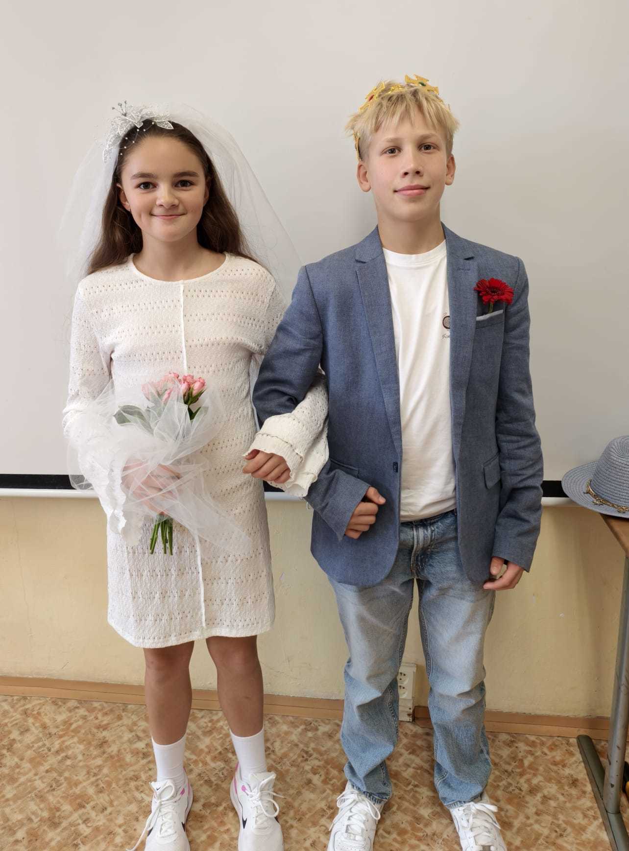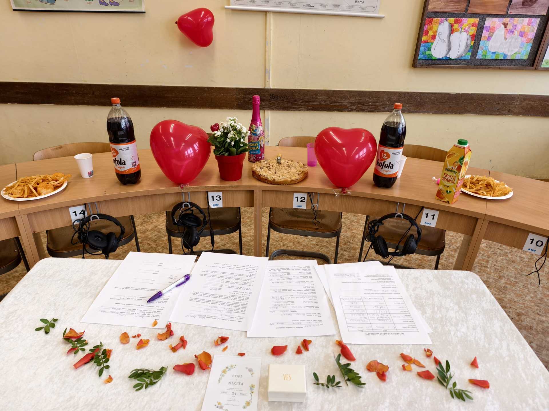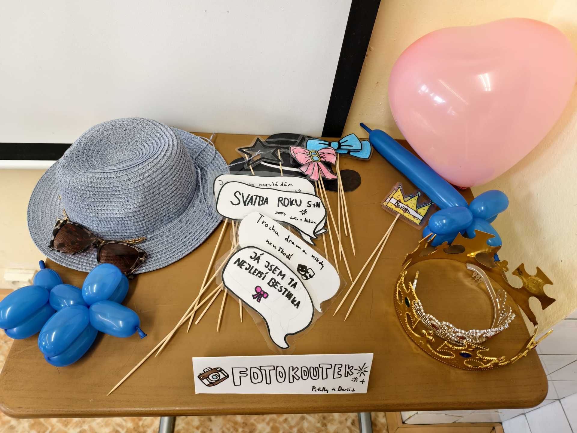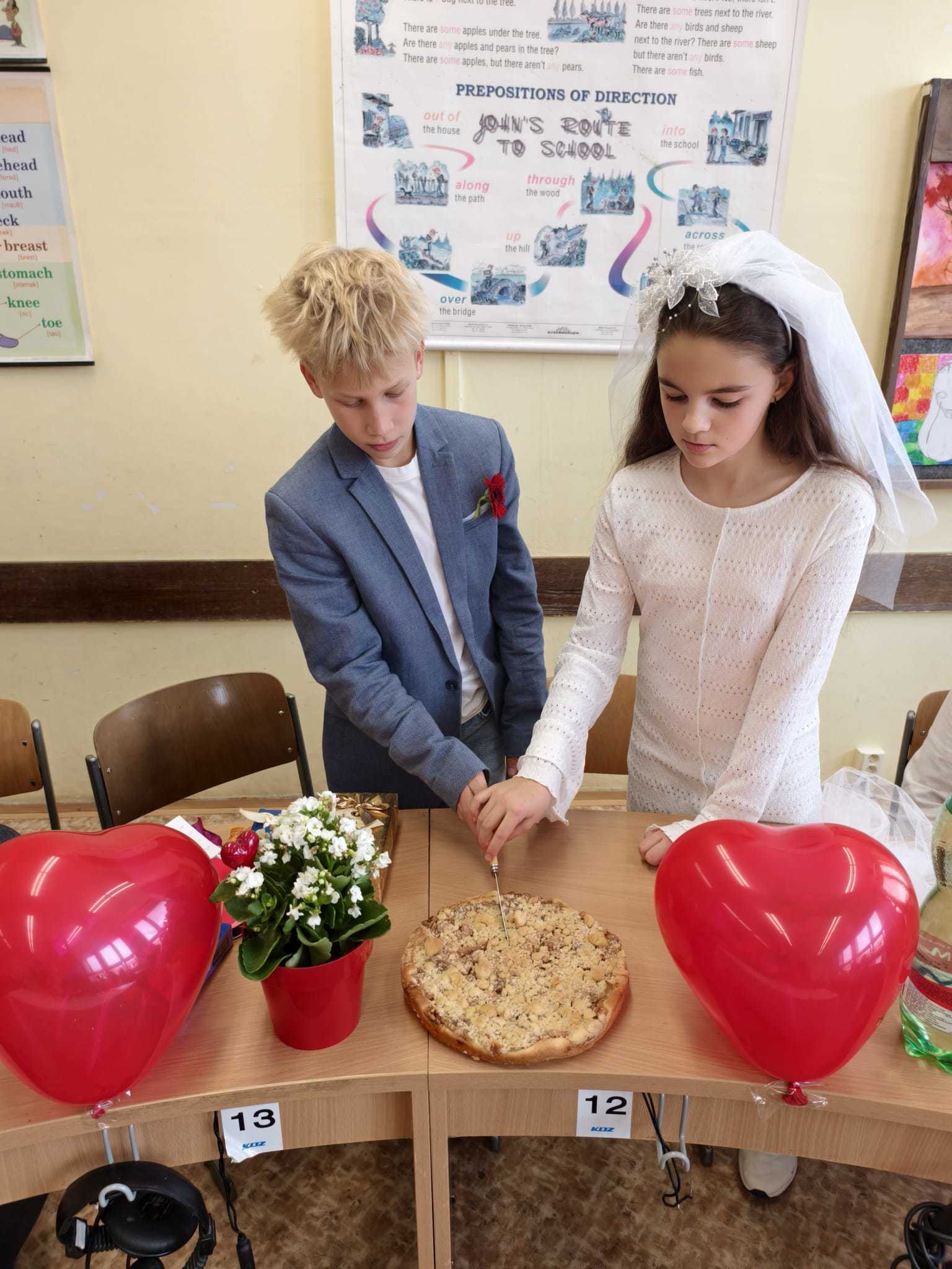 Samozřejmě nechybělo ani svatební oznámení, výzdoba, fotokoutek, hudba, pohoštění a slavnostní přípitek. Žáci mysleli i na tradiční zvyky – gratulace, první tanec novomanželů, proslov rodičů, krájení dortu nebo házení svatební kytice.