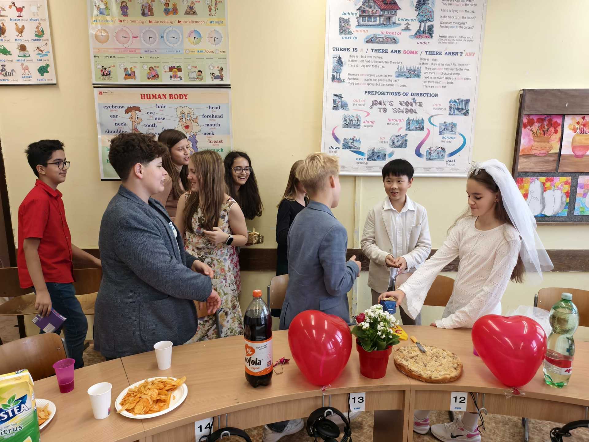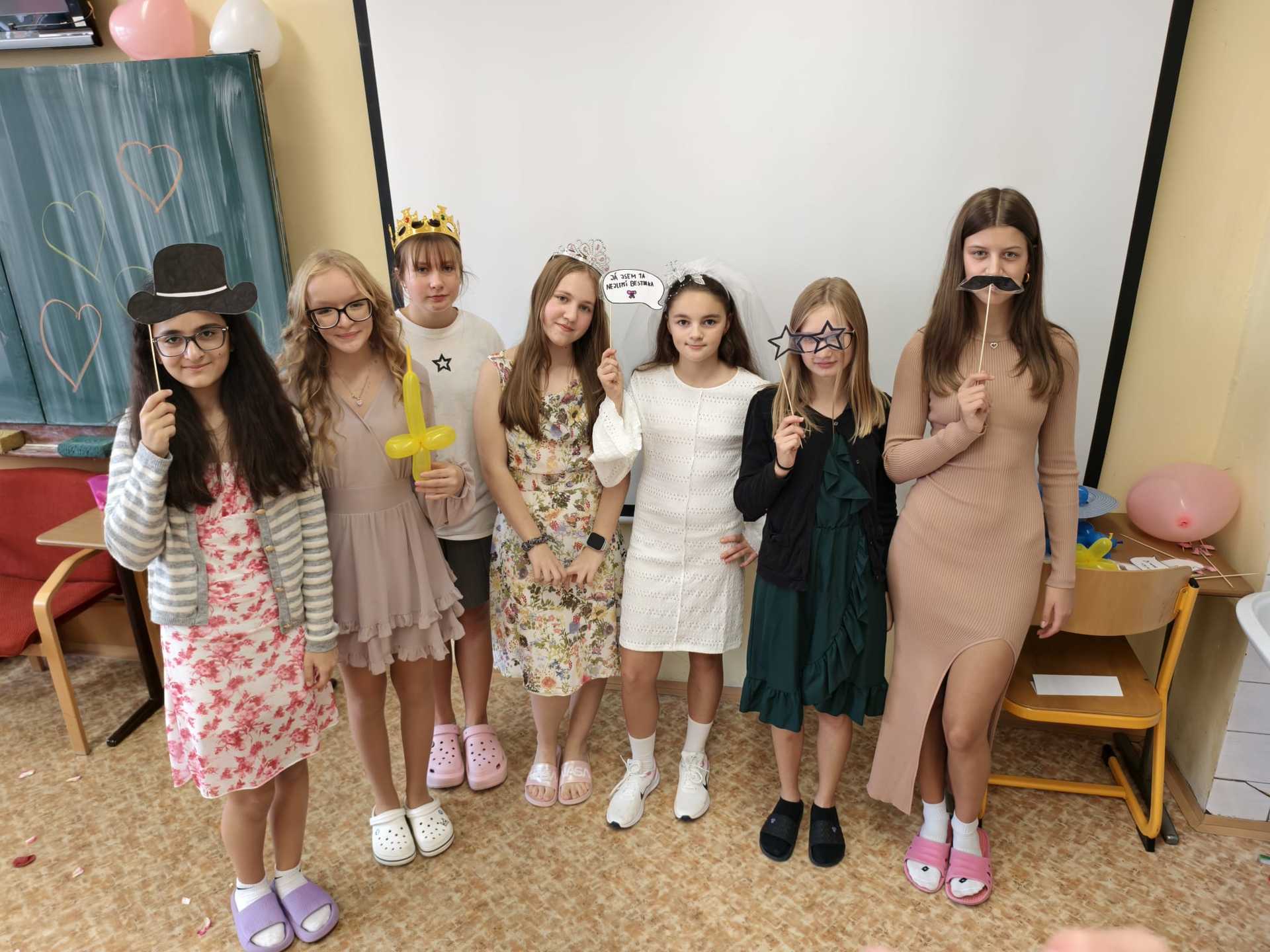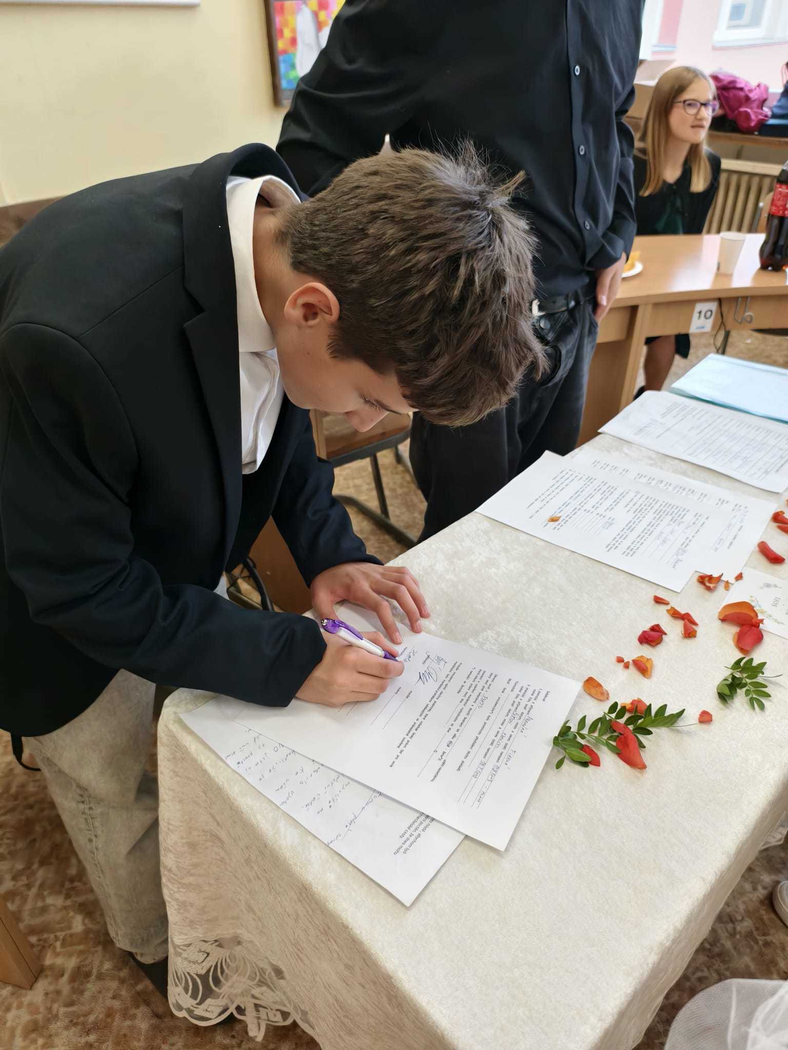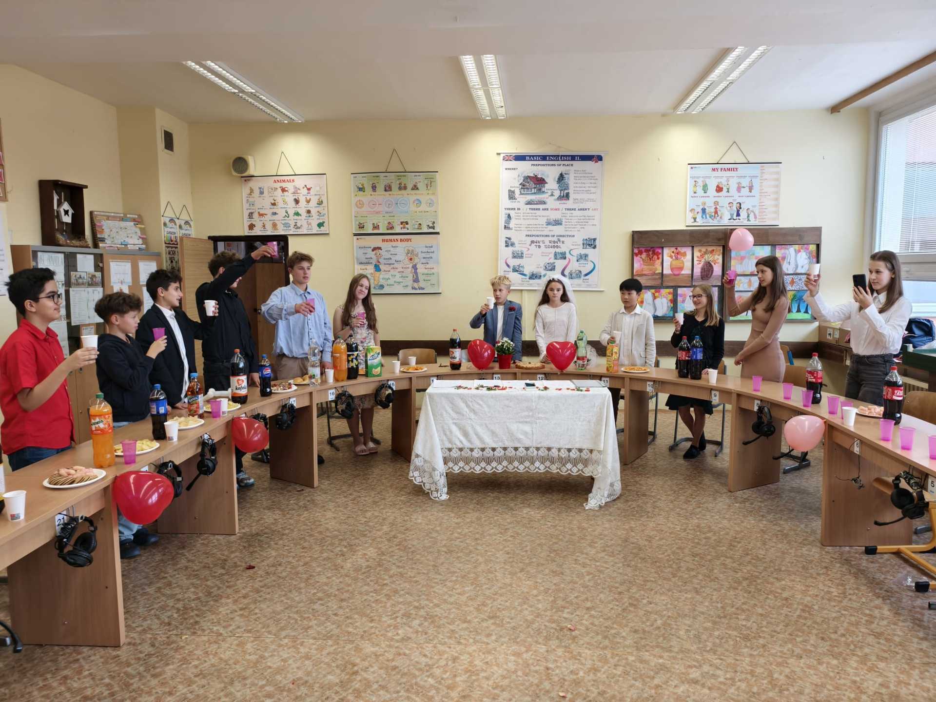 Samozřejmě nechybělo ani svatební oznámení, výzdoba, fotokoutek, hudba, pohoštění a slavnostní přípitek. Žáci mysleli i na tradiční zvyky – gratulace, první tanec novomanželů, proslov rodičů, krájení dortu nebo házení svatební kytice.
