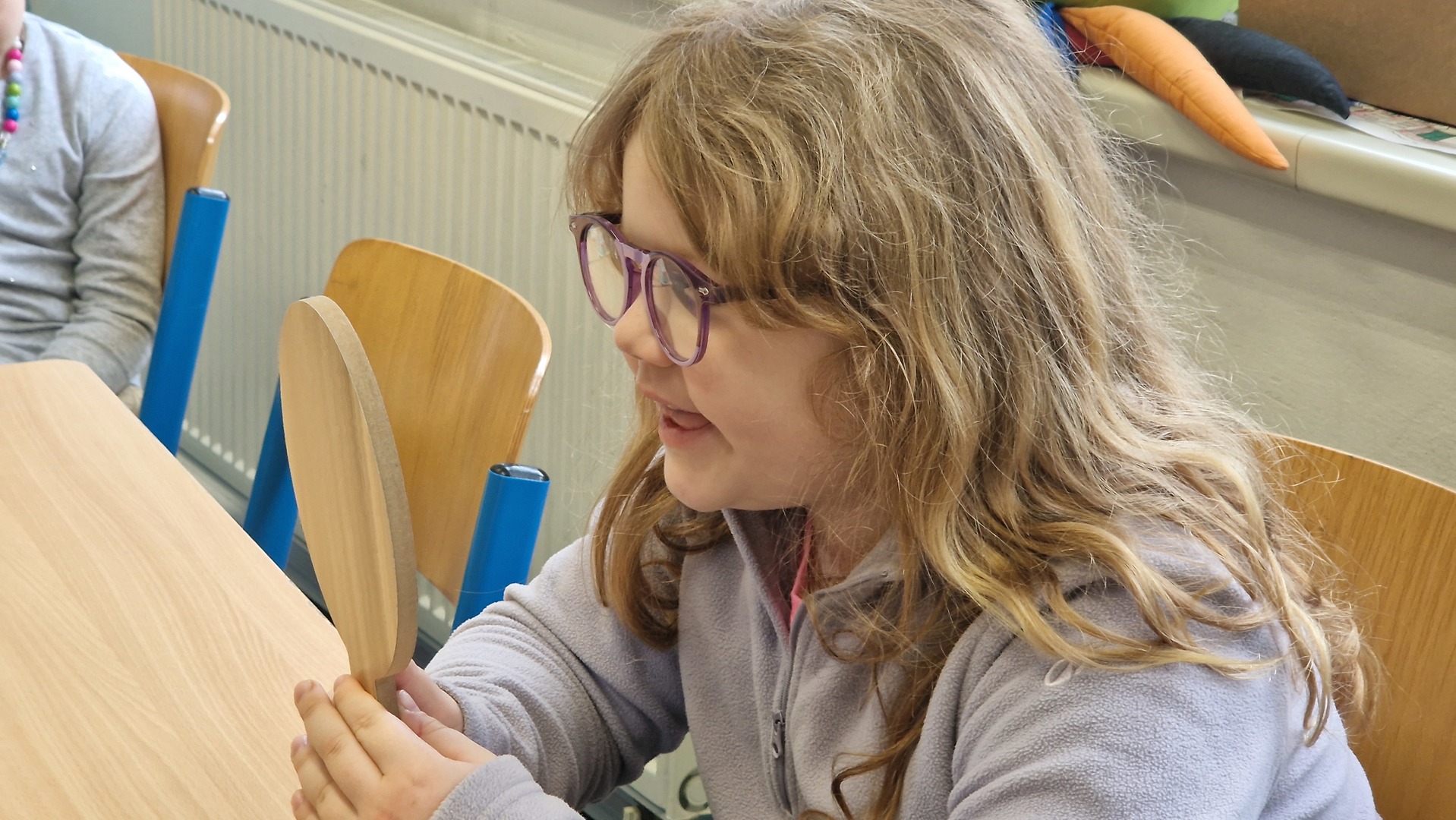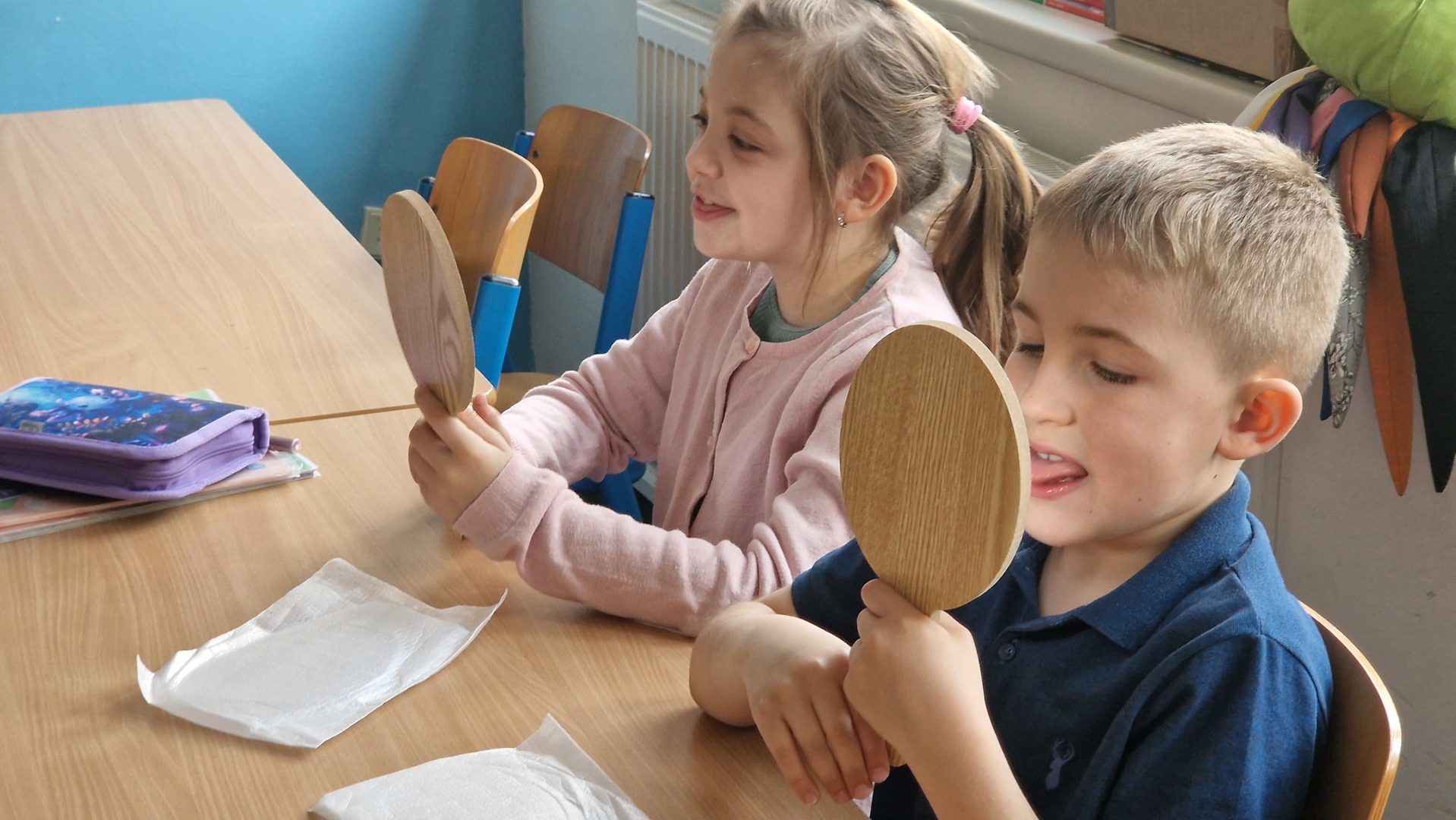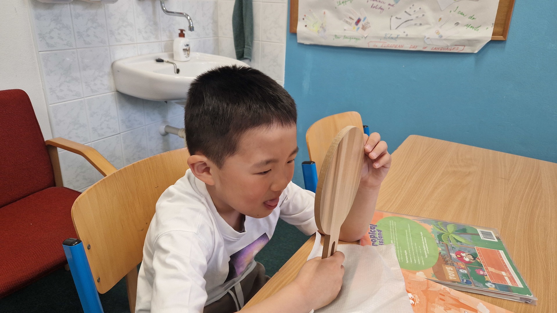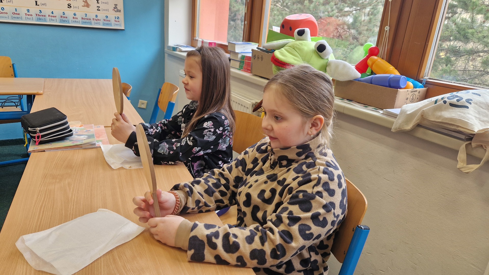 Děti při hodinách používají malá zrcátka, díky nimž sledují pohyb úst a lépe si osvojují správnou výslovnost. Tato metoda je baví a zároveň jim pomáhá vytvářet správné návyky hned od začátku. Právě proto má u nás ve výuce své pevné místo.