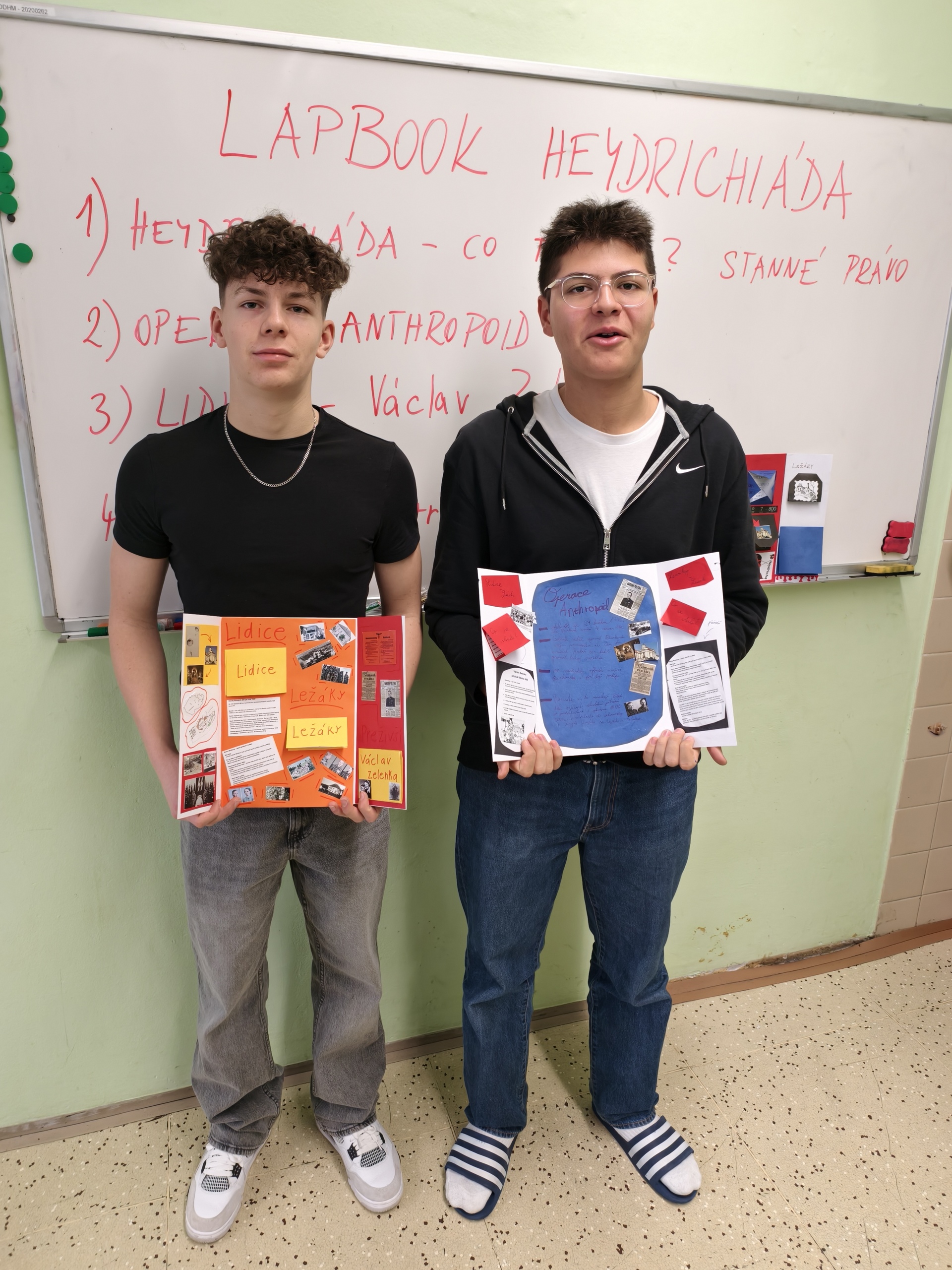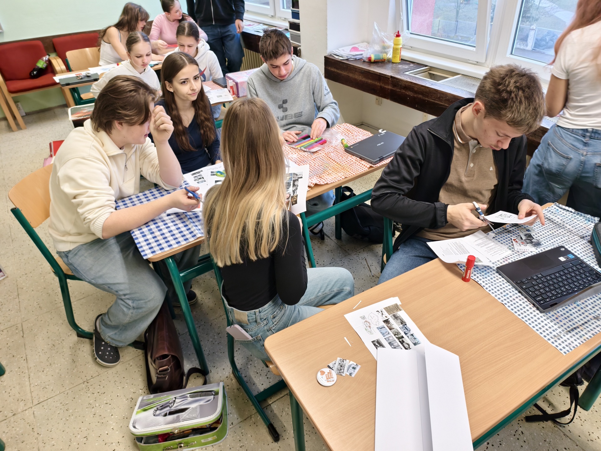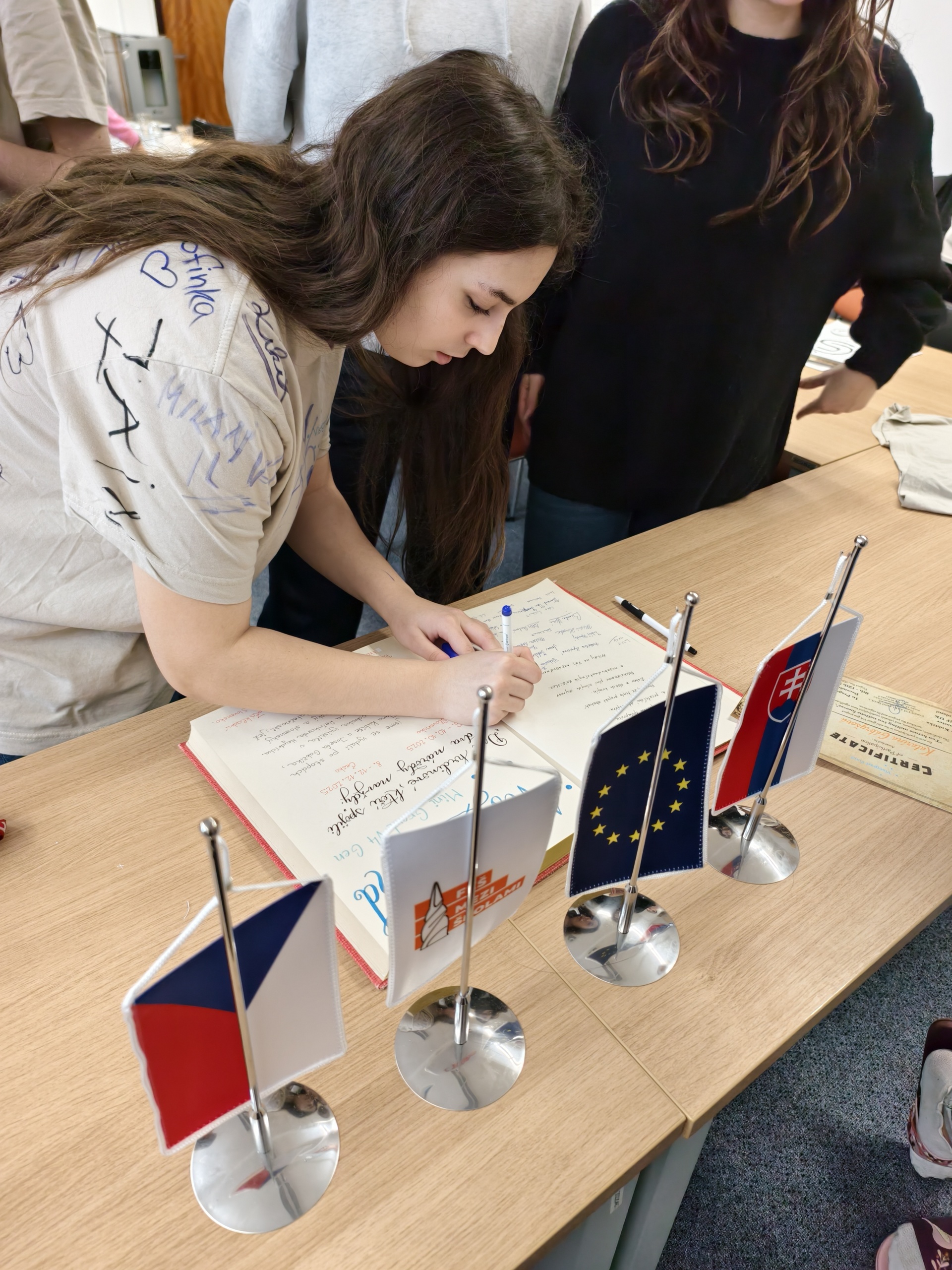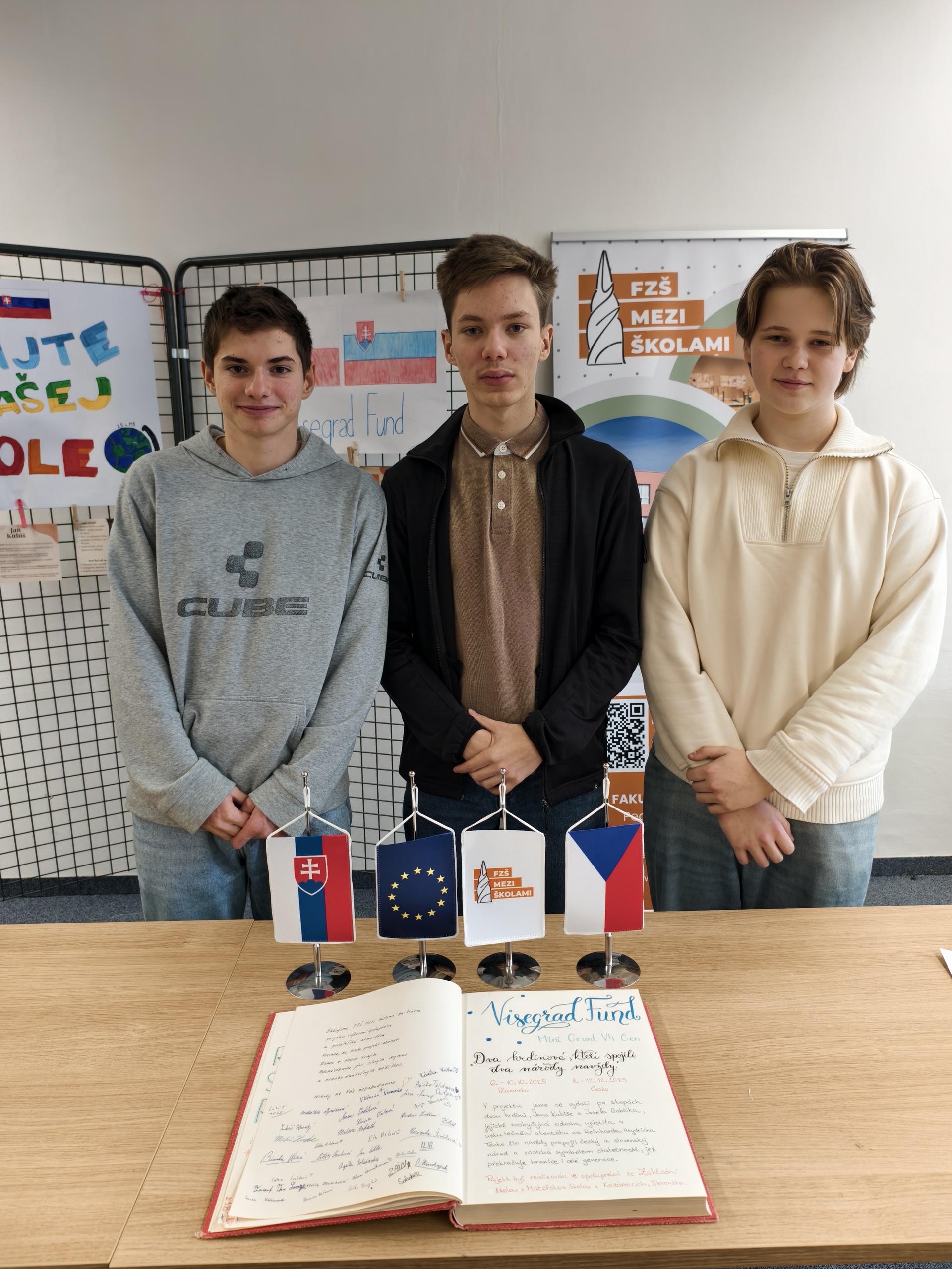 Poslední, pátý den projektu byl věnován společné práci, shrnutí získaných poznatků, vyhodnocení celého týdne, slavnostnímu zakončení i loučení. Den zahájila kreativní hodina dějepisu, během níž žáci aktivně využívali své dosavadní znalosti. V česko-slovenských dvojicích vytvářeli lapbooky, které originálním způsobem propojovaly historická fakta s kreativitou a týmovou spoluprací. Naplno se projevila jejich tvořivost i umělecké cítění, a že se lapbooky vydařily potvrzují i přiložené fotografie. Během přestávky si žáci pochutnali na koblihách. Poté následoval slavnostní závěrečný ceremoniál ve sborovně školy. Paní učitelky, které projekt vedly, shrnuly jeho průběh, poděkovaly partnerské škole za výbornou spolupráci a žákům za vzornou reprezentaci. Slovo si vzal také pan ředitel, který vyzdvihl význam spolupráce mezi českou a slovenskou partnerskou školou. Následovalo předávání certifikátů žákům i pedagogům. Nechyběly ani drobné dárky, za které patří velké poděkování našim sponzorům. Závěr projektu byl velmi emotivní – žáci si na památku podepisovali trička, při loučení byly i slzy. Projekt jim nepřinesl pouze nové znalosti z historie, ale především nová přátelství a pevné mezilidské vztahy, které jsou tou nejcennější hodnotou celé spolupráce. Společnou závěrečnou fotografií před školou jsme symbolicky uzavřeli visegrádský projekt a slovenské žáky poté čekala cesta domů.