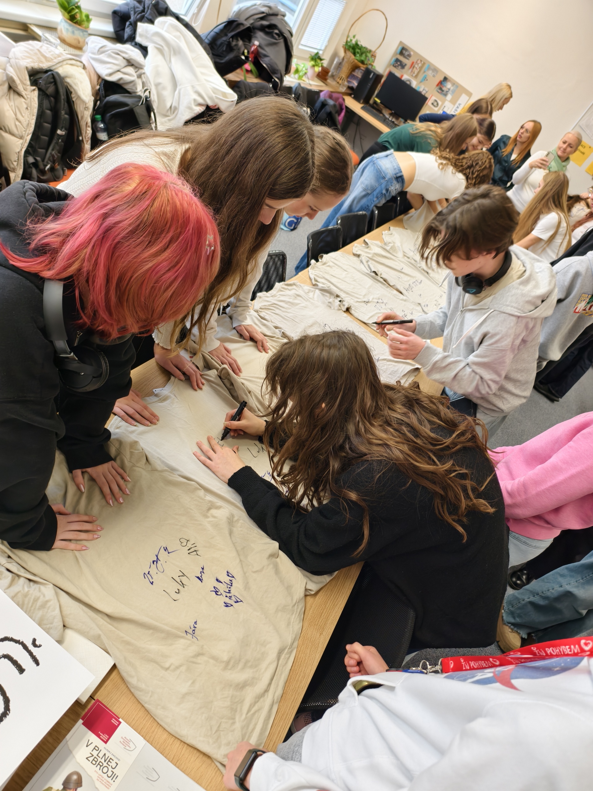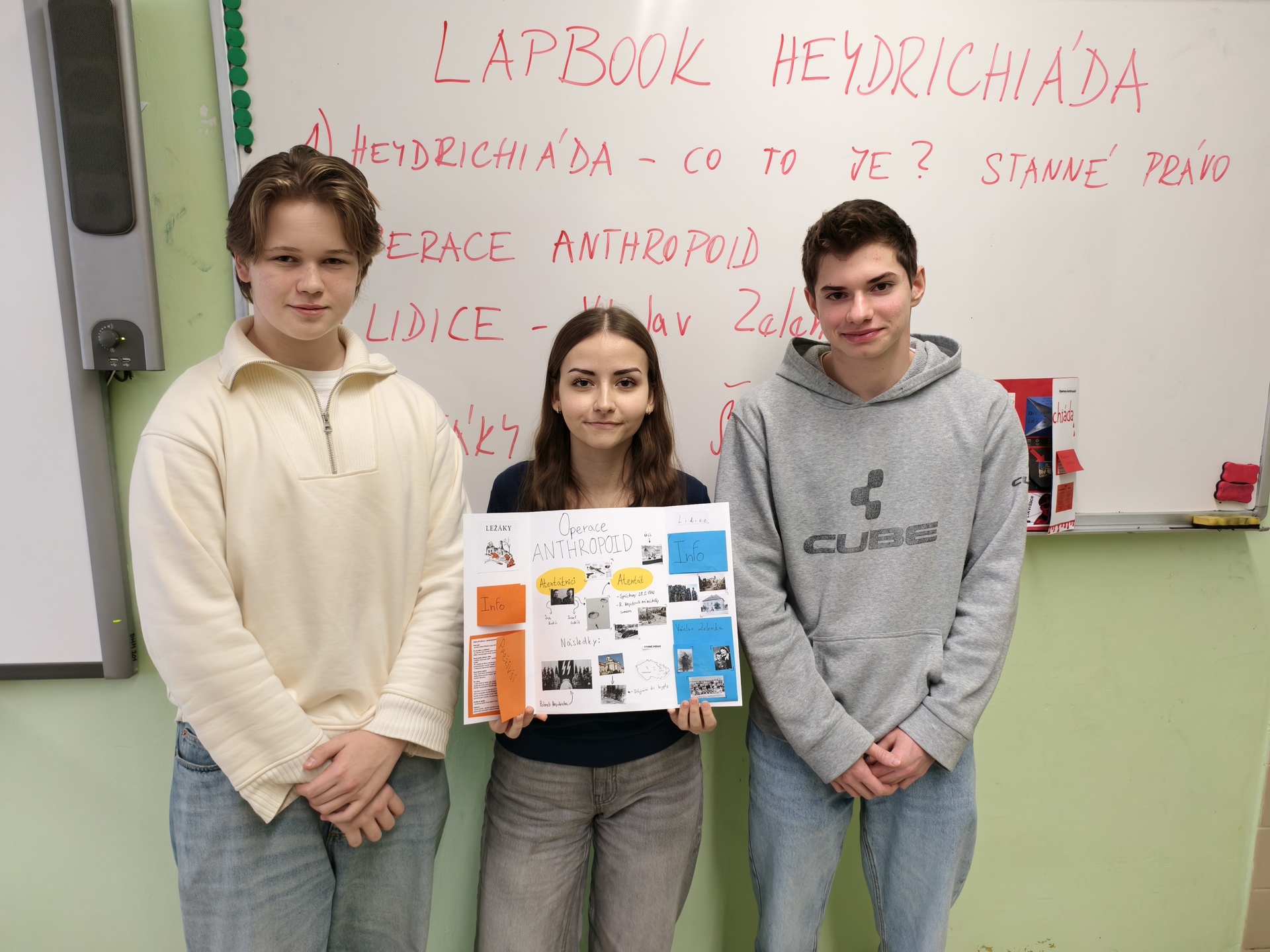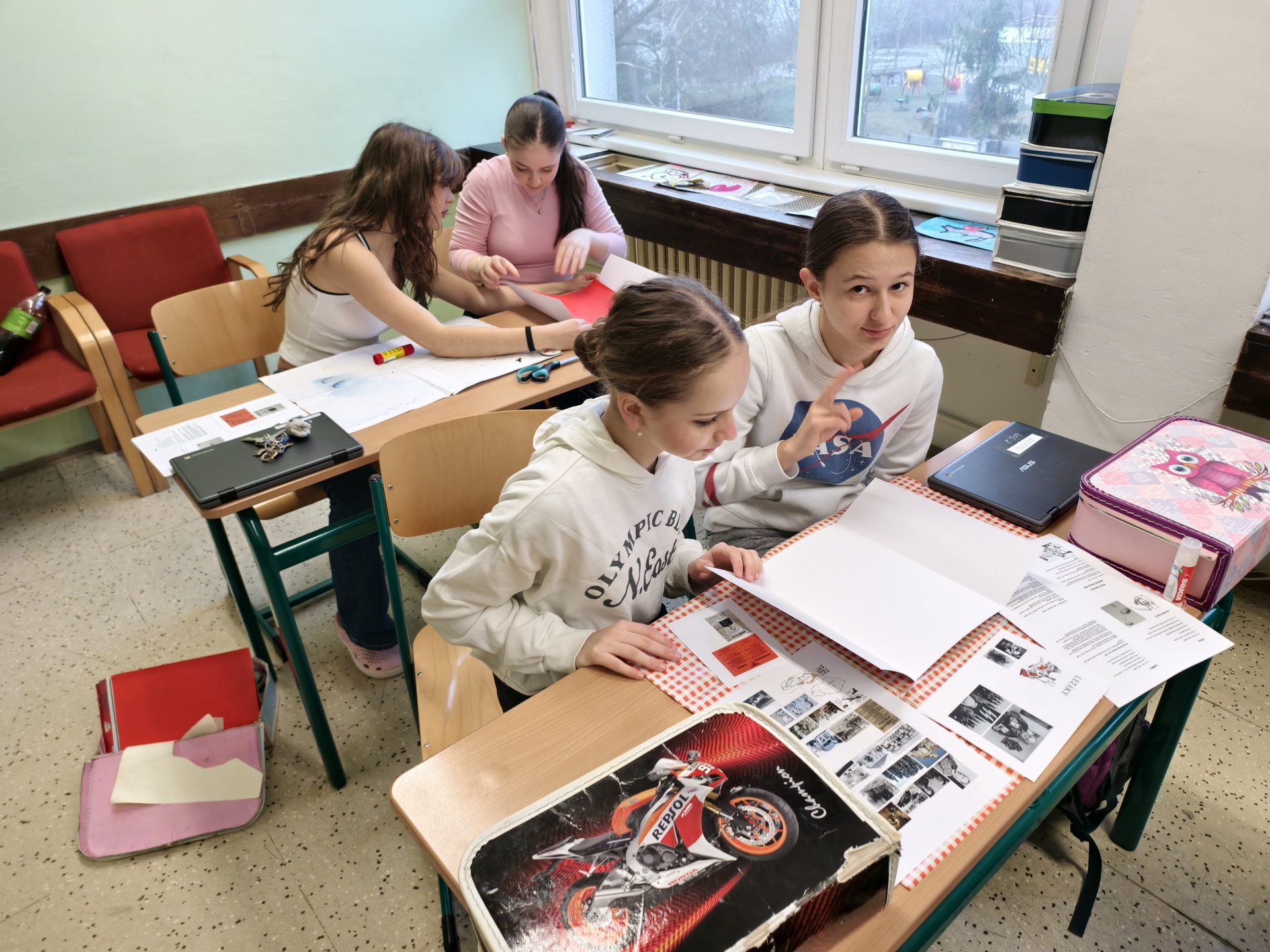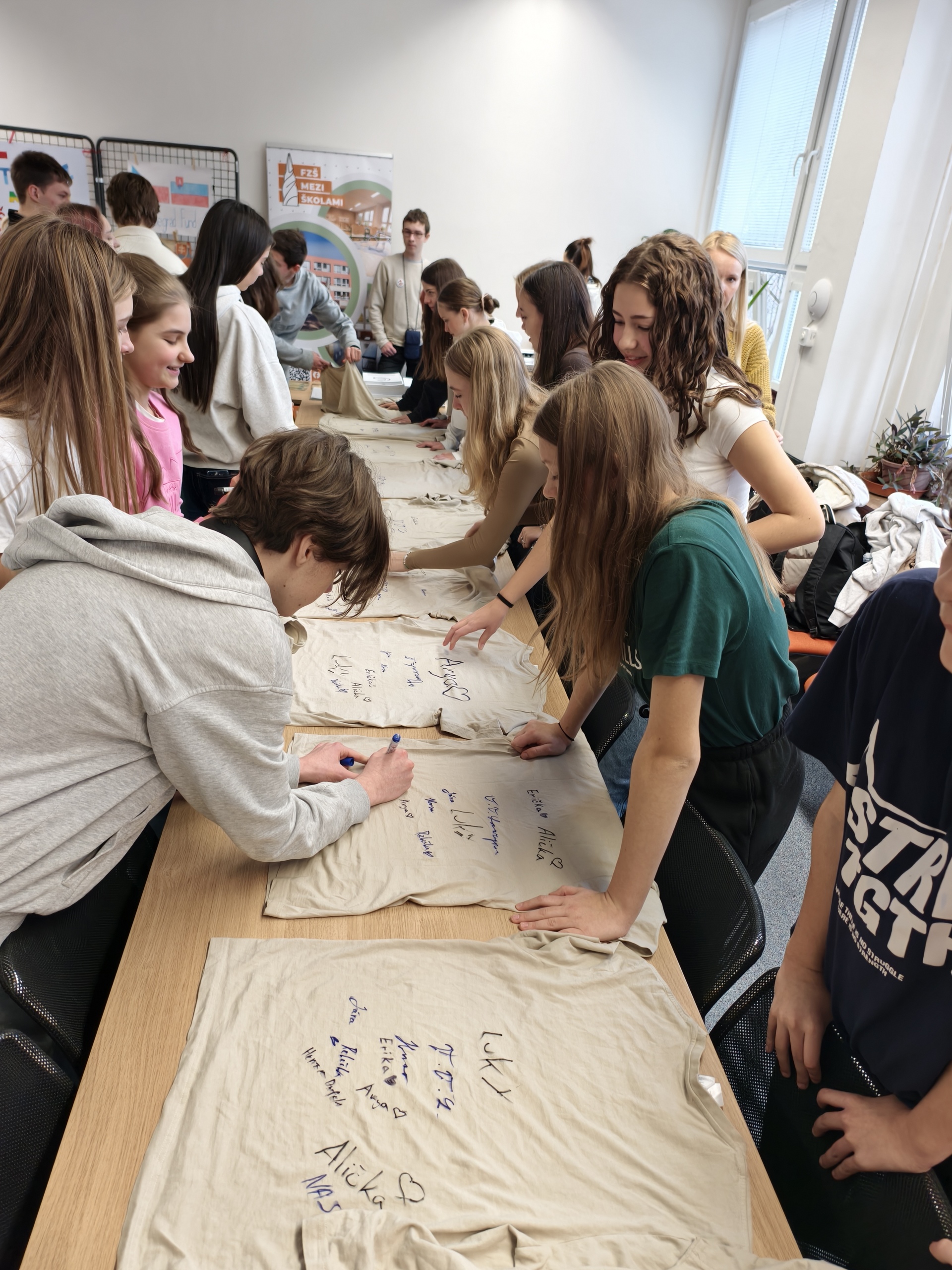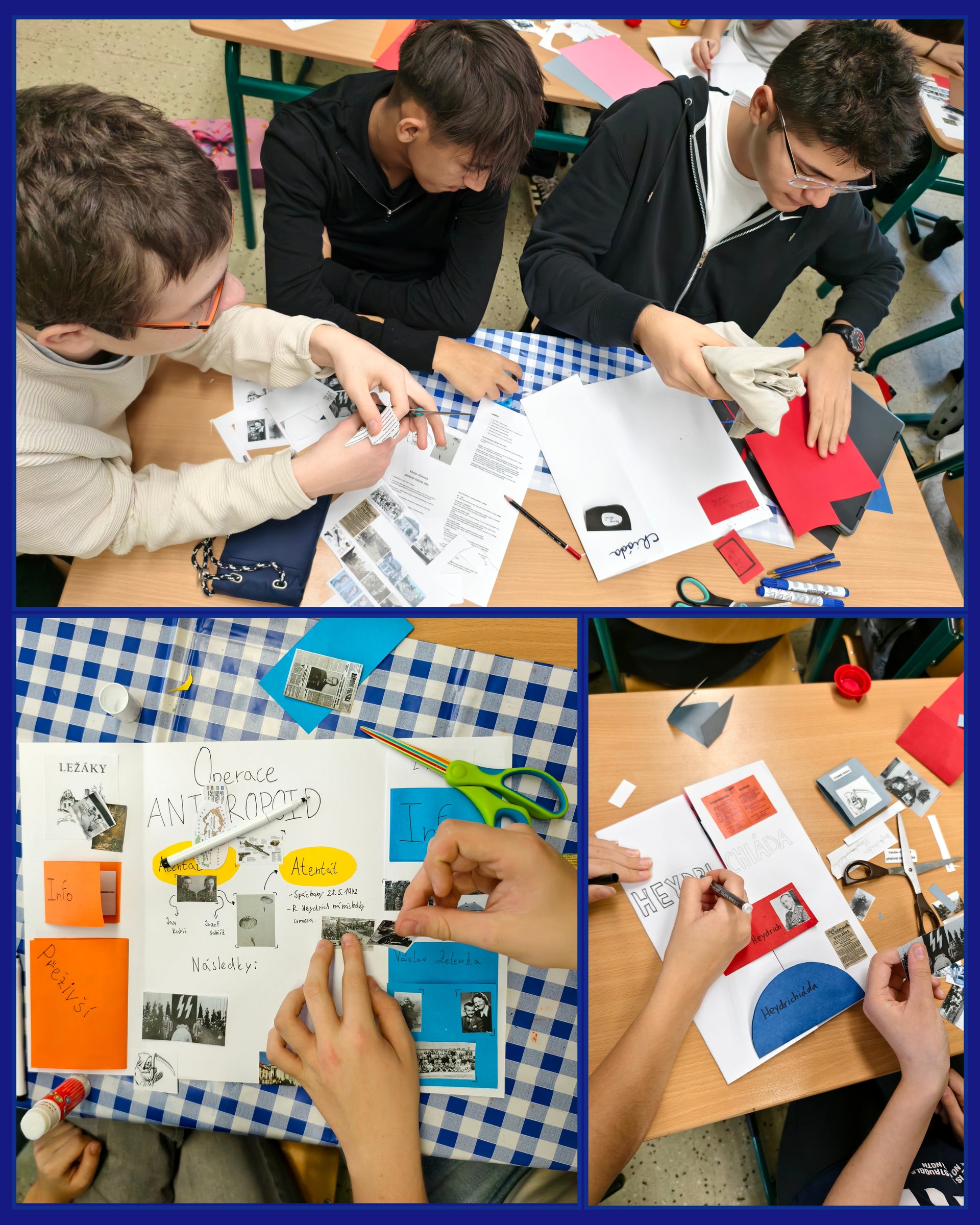 Poslední, pátý den projektu byl věnován společné práci, shrnutí získaných poznatků, vyhodnocení celého týdne, slavnostnímu zakončení i loučení. Den zahájila kreativní hodina dějepisu, během níž žáci aktivně využívali své dosavadní znalosti. V česko-slovenských dvojicích vytvářeli lapbooky, které originálním způsobem propojovaly historická fakta s kreativitou a týmovou spoluprací. Naplno se projevila jejich tvořivost i umělecké cítění, a že se lapbooky vydařily potvrzují i přiložené fotografie. Během přestávky si žáci pochutnali na koblihách. Poté následoval slavnostní závěrečný ceremoniál ve sborovně školy. Paní učitelky, které projekt vedly, shrnuly jeho průběh, poděkovaly partnerské škole za výbornou spolupráci a žákům za vzornou reprezentaci. Slovo si vzal také pan ředitel, který vyzdvihl význam spolupráce mezi českou a slovenskou partnerskou školou. Následovalo předávání certifikátů žákům i pedagogům. Nechyběly ani drobné dárky, za které patří velké poděkování našim sponzorům. Závěr projektu byl velmi emotivní – žáci si na památku podepisovali trička, při loučení byly i slzy. Projekt jim nepřinesl pouze nové znalosti z historie, ale především nová přátelství a pevné mezilidské vztahy, které jsou tou nejcennější hodnotou celé spolupráce. Společnou závěrečnou fotografií před školou jsme symbolicky uzavřeli visegrádský projekt a slovenské žáky poté čekala cesta domů.