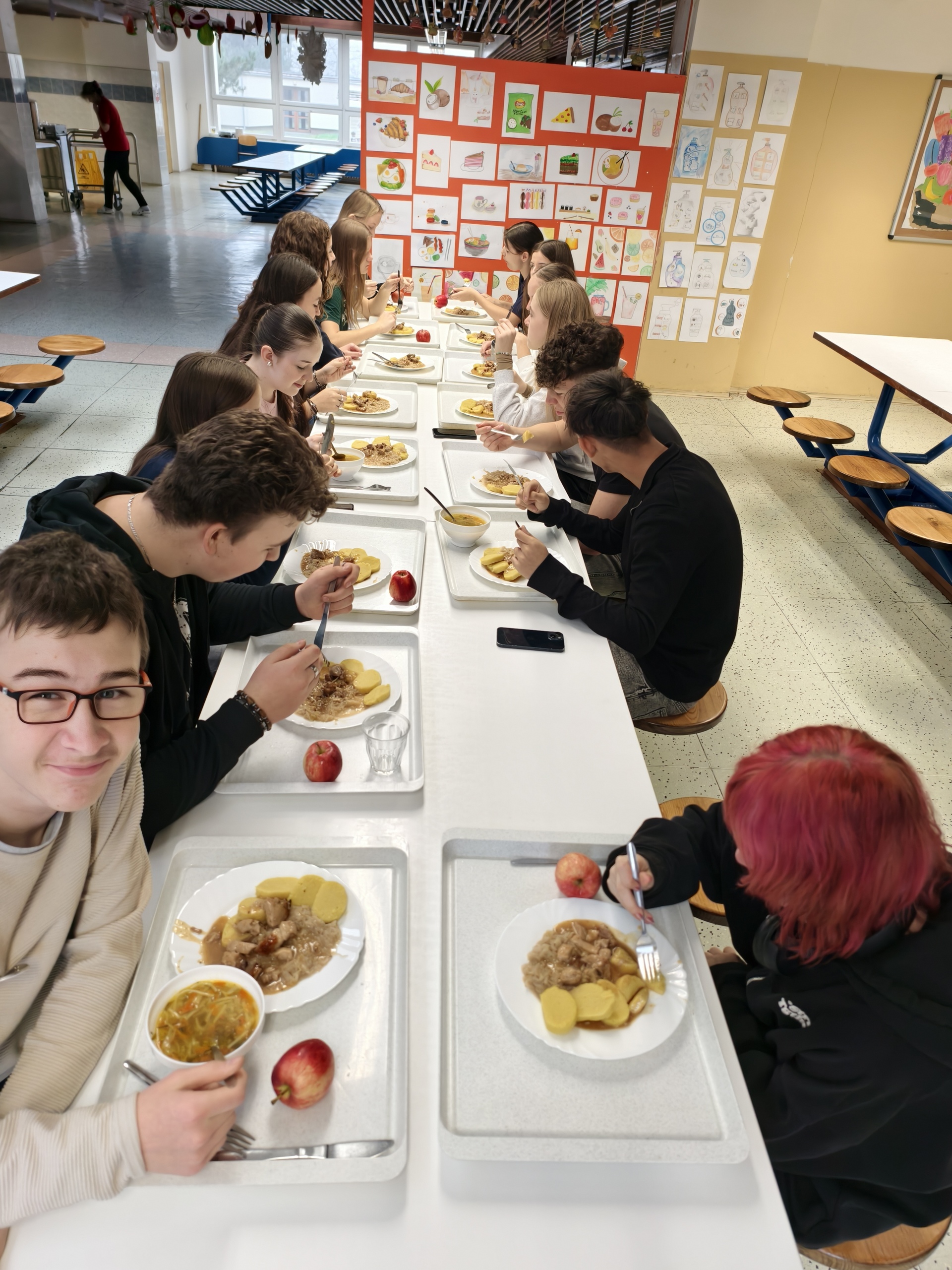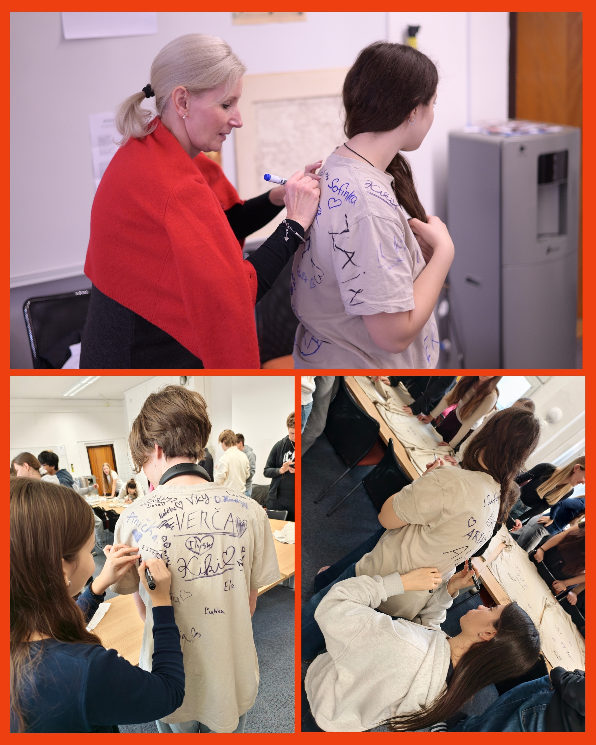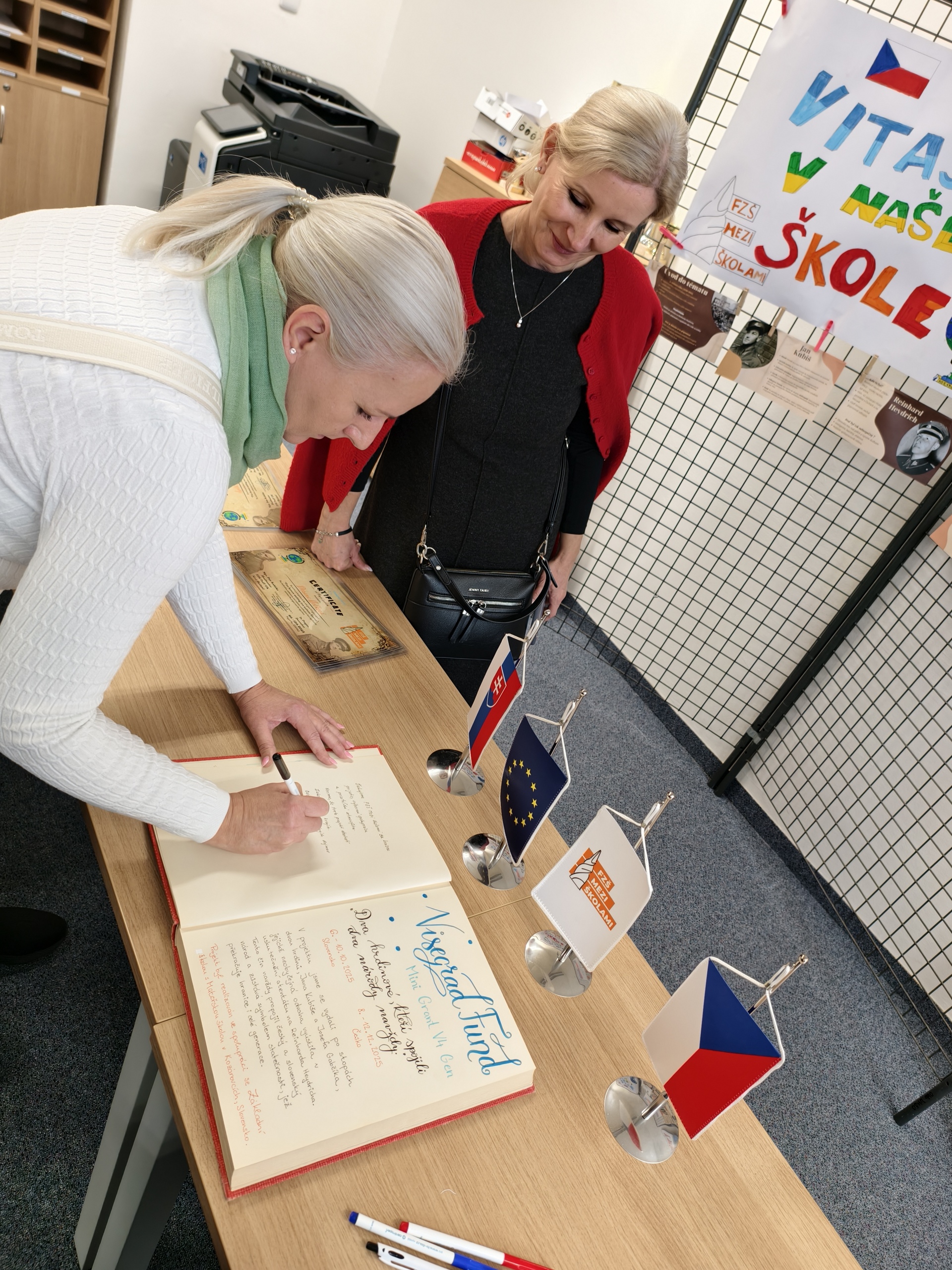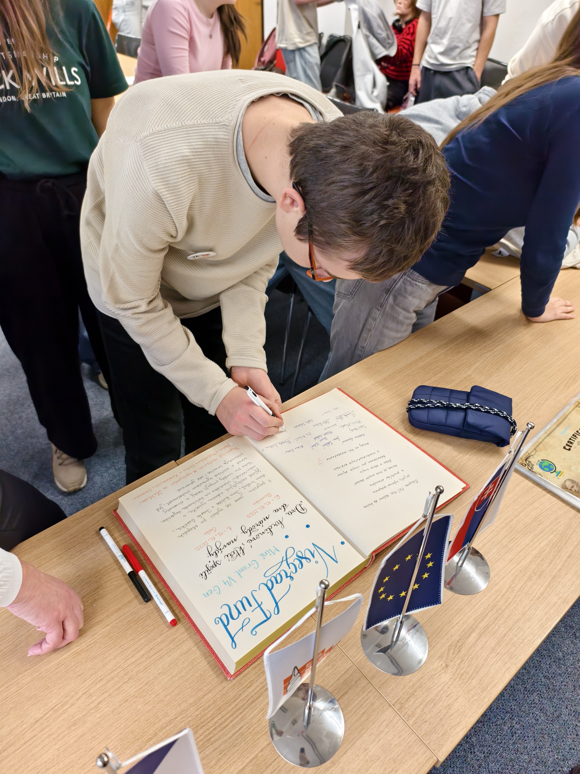Poslední, pátý den projektu byl věnován společné práci, shrnutí získaných poznatků, vyhodnocení celého týdne, slavnostnímu zakončení i loučení. Den zahájila kreativní hodina dějepisu, během níž žáci aktivně využívali své dosavadní znalosti. V česko-slovenských dvojicích vytvářeli lapbooky, které originálním způsobem propojovaly historická fakta s kreativitou a týmovou spoluprací. Naplno se projevila jejich tvořivost i umělecké cítění, a že se lapbooky vydařily potvrzují i přiložené fotografie. Během přestávky si žáci pochutnali na koblihách. Poté následoval slavnostní závěrečný ceremoniál ve sborovně školy. Paní učitelky, které projekt vedly, shrnuly jeho průběh, poděkovaly partnerské škole za výbornou spolupráci a žákům za vzornou reprezentaci. Slovo si vzal také pan ředitel, který vyzdvihl význam spolupráce mezi českou a slovenskou partnerskou školou. Následovalo předávání certifikátů žákům i pedagogům. Nechyběly ani drobné dárky, za které patří velké poděkování našim sponzorům. Závěr projektu byl velmi emotivní – žáci si na památku podepisovali trička, při loučení byly i slzy. Projekt jim nepřinesl pouze nové znalosti z historie, ale především nová přátelství a pevné mezilidské vztahy, které jsou tou nejcennější hodnotou celé spolupráce. Společnou závěrečnou fotografií před školou jsme symbolicky uzavřeli visegrádský projekt a slovenské žáky poté čekala cesta domů.